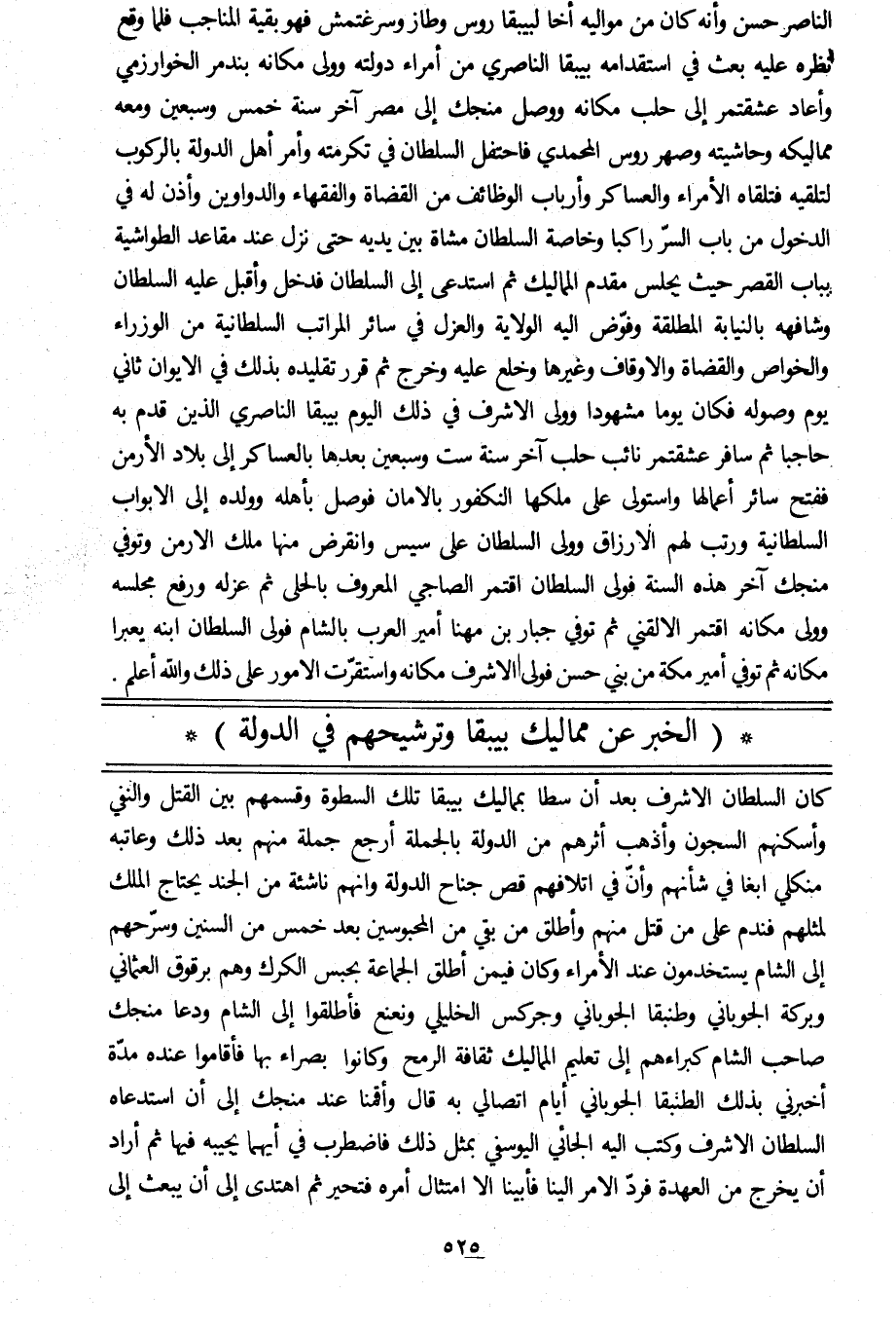الناصر حسن وأنه كان من مواليه أخا لبيبقاروس وطاز وسرغتمش فهو بقية المناجب فلما وقع نظره عليه بعث في استقدامه بيبقا الناصري من أمراء دولته وولى مكانه بندمر الخوارزمي وأعاد عشقتمر إلى حلب مكانه ووصل منجك إلى مصر آخر سنة خمس وسبعين ومعه مماليكه وحاشيته وصهر روس المحمدي فاحتفل السلطان في تكرمته وأمر أهل الدولة بالركوب لتلقيه فتلقاه الأمراء والعساكر وأرباب الوظائف من القضاة والفقهاء والدواوين وأذن له في الدخول من باب السرّ راكبا وخاصة السلطان مشاة بين يديه حتى نزل عند مقاعد الطواشية بباب القصر حيث يجلس مقدم المماليك ثم استدعى إلى السلطان فدخل وأقبل عليه السلطان وشافهه بالنيابة المطلقة وفوّض اليه الولاية والعزل في سائر المراتب السلطانية من الوزراء والخواص والقضاة والأوقاف وغيرها وخلع عليه وخرج ثم قرر تقليده بذلك في الإيوان ثاني يوم وصوله فكان يوما مشهودا وولى الأشرف في ذلك اليوم بيبقا الناصري الذين قدم به حاجبا ثم سافر عشقتمر نائب حلب آخر سنة ست وسبعين بعدها بالعساكر إلى بلاد الأرمن ففتح سائر أعمالها واستولى على ملكها النكفور بالأمان فوصل بأهله وولده إلى الأبواب السلطانية ورتب لهم الأرزاق وولى السلطان على سيس وانقرض منها ملك الأرمن وتوفي منجك آخر هذه السنة فولى السلطان اقتمر الصاجي المعروف بالحلى ثم عزله ورفع مجلسه وولى مكانه اقتمر الالقني ثم توفي جبار بن مهنا أمير العرب بالشام فولى السلطان ابنه يعبرا مكانه ثم توفي أمير مكة من بني حسن فولى الأشرف مكانه واستقرّت الأمور على ذلك والله أعلم.