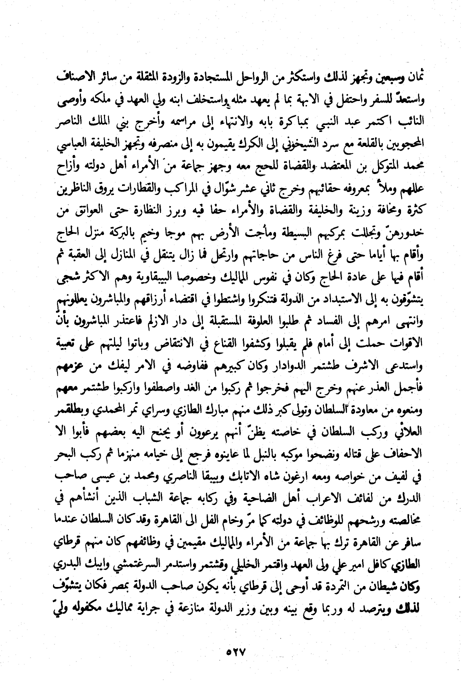ثمان وسبعين وتجهز لذلك واستكثر من الرواحل المستجادة والزودة المثقلة من سائر الأصناف واستعدّ للسفر واحتفل في الابهة بما لم يعهد مثله واستخلف ابنه ولي العهد في ملكه وأوصى النائب اكتمر عبد النبي بمباكرة بابه والانتهاء إلى مراسمه وأخرج بني الملك الناصر المحجوبين بالقلعة مع سرد الشيخوني إلى الكرك يقيمون به إلى منصرفه وتجهز الخليفة العباسي محمد المتوكل بن المعتضد والقضاة للحج معه وجهز جماعة من الأمراء أهل دولته وأزاح عللهم وملأ بمعروفه حقائبهم وخرج ثاني عشر شوّال في المراكب والقطارات يروق الناظرين كثرة ومخافة وزينة والخليفة والقضاة والأمراء حفا فيه وبرز النظارة حتى العواتق من خدورهنّ وتجللت بمركبهم البسيطة وماجت الأرض بهم موجا وخيم بالبركة منزل الحاج وأقام بها أياما حتى فرغ الناس من حاجاتهم وارتحل فما زال ينتقل في المنازل إلى العقبة ثم أقام فيها على عادة الحاج وكان في نفوس المماليك وخصوصا البيبقاوية وهم الأكثر شجى يتشوّقون به إلى الاستبداد من الدولة فتنكروا واشتطوا في اقتضاء أرزاقهم والمباشرون يعللونهم وانتهى أمرهم إلى الفساد ثم طلبوا العلوفة المستقبلة إلى دار الازلم فاعتذر المباشرون بأنّ الأقوات حملت إلى أمام فلم يقبلوا وكشفوا القناع في الانتقاض وباتوا ليلتهم على تعبية واستدعى الأشرف طشتمر الدوادار وكان كبيرهم ففاوضه في الأمر ليفك من عزمهم فأجمل العذر عنهم وخرج اليهم فخرجوا ثم ركبوا من الغد واصطفوا واركبوا طشتمر معهم ومنعوه من معاودة السلطان وتولى كبر ذلك منهم مبارك الطازي وسراي تمر المحمدي وبطلقمر العلائي وركب السلطان في خاصته يظنّ أنهم يرعوون أو يحنح اليه بعضهم فأبوا الا الاحفاف على قتاله ونضحوا موكبه بالنبل لما عاينوه فرجع إلى خيامه منهزما ثم ركب البحر في لفيف من خواصه ومعه ارغون شاه الاتابك وبيبقا الناصري ومحمد بن عيسى صاحب الدرك من لفائف الاعراب أهل الضاحية وفي ركابه جماعة الشباب الذين أنشأهم في مخالصته ورشحهم للوظائف في دولته كما مرّ وخام الفل الى القاهرة وقد كان السلطان عند ما سافر عن القاهرة ترك بها جماعة من الأمراء والمماليك مقيمين في وظائفهم كان منهم قرطاي الطازي كافل أمير علي ولى العهد واقتمر الخليلي وقشتمر واستدمر السرغتمشي وايبك البدري وكان شيطان من التمردة قد أوحى إلى قرطاي بأنه يكون صاحب الدولة بمصر فكان يتشوّف لذلك ويترصد له وربما وقع بينه وبين وزير الدولة منازعة في جراية مماليك مكفوله وليّ