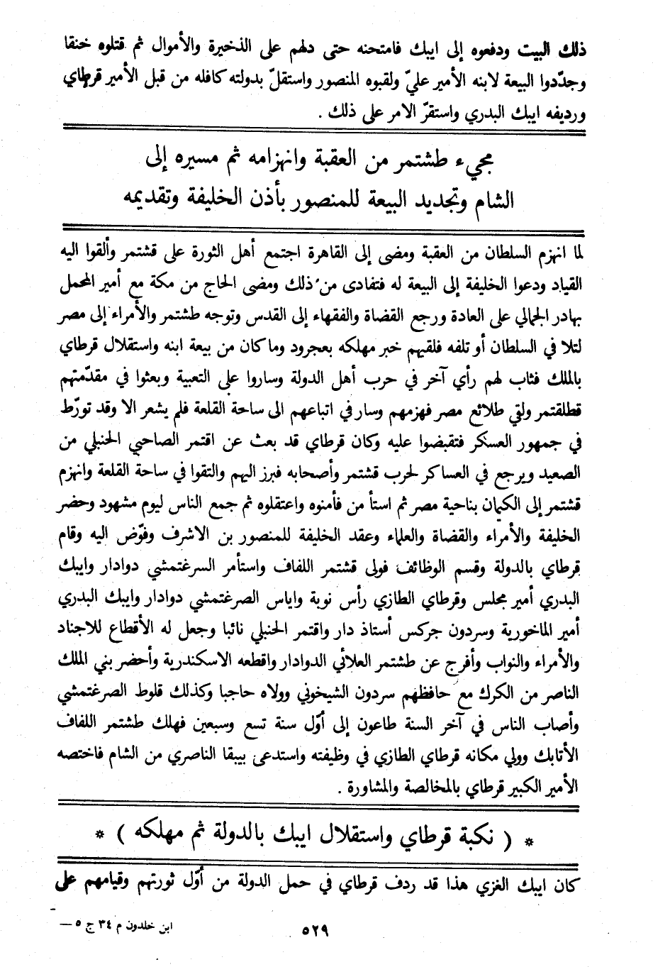 لما انهزم السلطان من العقبة ومضى إلى القاهرة اجتمع أهل الثورة على قشتمر وألقوا اليه القياد ودعوا الخليفة إلى البيعة له فتفادى من ذلك ومضى الحاج من مكة مع أمير المحمل بهادر الجمالي على العادة ورجع القضاة والفقهاء إلى القدس وتوجه طشتمر والأمراء إلى مصر لتلافي السلطان أو تلفه فلقيهم خبر مهلكه بعجرود وما كان من بيعة ابنه واستقلال قرطاي بالملك فثاب لهم رأي آخر في حرب أهل الدولة وساروا على التعبية وبعثوا في مقدّمتهم قطلقتمر ولقي طلائع مصر فهزمهم وسار في اتباعهم الى ساحة القلعة فلم يشعر الا وقد تورّط في جمهور العسكر فتقبضوا عليه وكان قرطاي قد بعث عن اقتمر الصاحبي الحنبلي من الصعيد ويرجع في العساكر لحرب قشتمر وأصحابه فبرز اليهم والتقوا في ساحة القلعة وانهزم قشتمر إلى الكيمان بناحية مصر ثم استأمن فأمنوه واعتقلوه ثم جمع الناس ليوم مشهود وحضر الخليفة والأمراء والقضاة والعلماء وعقد الخليفة للمنصور بن الأشرف وفوّض اليه وقام قرطاي بالدولة وقسم الوظائف فولى قشتمر اللفاف واستأمر السرغتمشي دوادار وايبك البدري أمير مجلس وقرطاي الطازي رأس نوبة واياس الصرغتمشي دوادار وايبك البدري أمير الماخورية وسردون جركس أستاذ دار واقتمر الحنبلي نائبا وجعل له الأقطاع للاجناد والأمراء والنواب وأفرج عن طشتمر العلائي الدوادار واقطعه الاسكندرية وأحضر بني الملك الناصر من الكرك مع حافظهم سردون الشيخوني وولاه حاجبا وكذلك قلوط الصرغتمشي وأصاب الناس في آخر السنة طاعون إلى أوّل سنة تسع وسبعين فهلك طشتمر اللفاف الأتابك وولي مكانه قرطاي الطازي في وظيفته واستدعى بيبقا الناصري من الشام فاختصه الأمير الكبير قرطاي بالمخالصة والمشاورة.