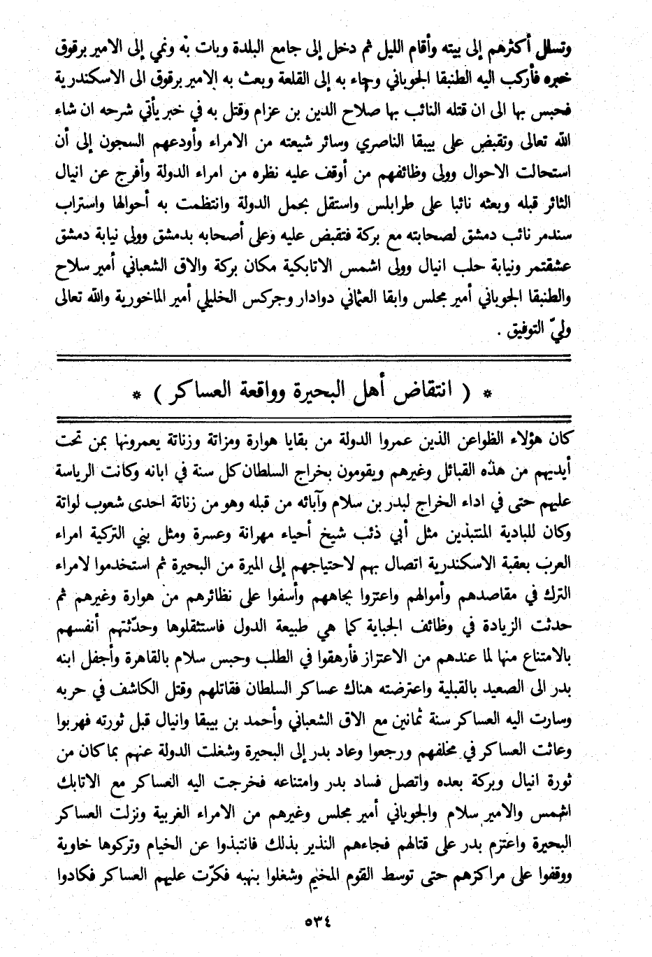 وتسلل أكثرهم إلى بيته وأقام الليل ثم دخل إلى جامع البلدة وبات به ونمي إلى الأمير برقوق خبره فأركب اليه الطنبقا الجوباني وجاء به إلى القلعة وبعث به الأمير برقوق الى الاسكندرية فحبس بها الى ان قتله النائب بها صلاح الدين بن عزام وقتل به في خبر يأتي شرحه ان شاء الله تعالى وتقبض على بيبقا الناصري وسائر شيعته من الأمراء وأودعهم السجون إلى أن استحالت الأحوال وولى وظائفهم من أوقف عليه نظره من أمراء الدولة وأفرج عن انيال الثائر قبله وبعثه نائبا على طرابلس واستقل بحمل الدولة وانتظمت به أحوالها واستراب سندمر نائب دمشق لصحابته مع بركة فتقبض عليه وعلى أصحابه بدمشق وولى نيابة دمشق عشقتمر ونيابة حلب انيال وولى اشمس الاتابكية مكان بركة والاق الشعبانيّ أمير سلاح والطنبقا الجوباني أمير مجلس وابقا العثماني دوادار وجركس الخليلي أمير الماخورية والله تعالى وليّ التوفيق.