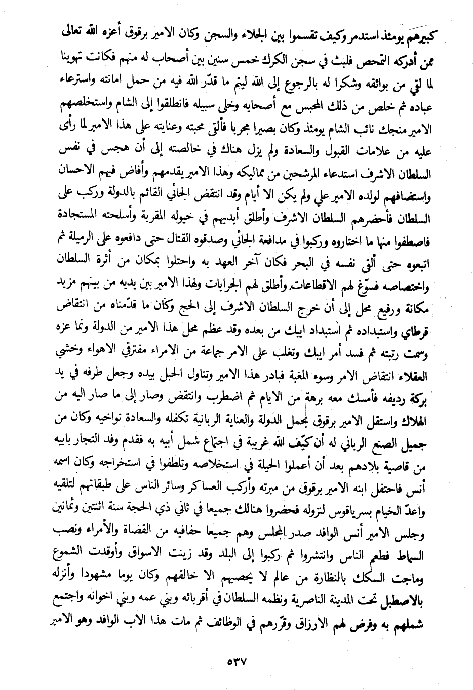 كبيرهم يومئذ استدمر وكيف تقسموا بين الجلاء والسجن وكان الأمير برقوق أعزه الله تعالى ممن أدركه التمحص فلبث في سجن الكرك خمس سنين بين أصحاب له منهم فكانت تهوينا لما لقي من بوائقه وشكرا له بالرجوع إلى الله ليتم ما قدّر الله فيه من حمل أمانته واسترعاء عباده ثم خلص من ذلك المحبس مع أصحابه وخلى سبيله فانطلقوا إلى الشام واستخلصهم الأمير منجك نائب الشام يومئذ وكان بصيرا مجربا فألقى محبته وعنايته على هذا الأمير لما رأى عليه من علامات القبول والسعادة ولم يزل هناك في خالصته إلى أن هجس في نفس السلطان الأشرف استدعاء المرشحين من مماليكه وهذا الأمير يقدمهم وأفاض فيهم الإحسان واستضافهم لولده الأمير علي ولم يكن الا أيام وقد انتقض الجائي القائم بالدولة وركب على السلطان فأحضرهم السلطان الأشرف وأطلق أيديهم في خيوله المقربة وأسلحته المستجادة فاصطفوا منها ما اختاروه وركبوا في مدافعة الجائي وصدقوه القتال حتى دافعوه على الرميلة ثم اتبعوه حتى ألقى نفسه في البحر فكان آخر العهد به واحتلوا بمكان من أثرة السلطان واختصاصه فسوّغ لهم الاقطاعات وأطلق لهم الجرايات ولهذا الأمير بين يديه من بينهم مزيد مكانة ورفيع محل إلى أن خرج السلطان الأشرف إلى الحج وكان ما قدّمناه من انتقاض قرطاي واستبداده ثم استبداد ايبك من بعده وقد عظم محل هذا الأمير من الدولة ونما عزه وسمت رتبته ثم فسد أمر أيبك وتغلب على الأمر جماعة من الأمراء مفترقي الاهواء وخشي العقلاء انتقاض الأمر وسوء المغبة فبادر هذا الأمير وتناول الحبل بيده وجعل طرفه في يد بركة رديفه فأمسك معه برهة من الأيام ثم اضطرب وانتقض وصار إلى ما صار اليه من الهلاك واستقل الأمير برقوق بحمل الدولة والعناية الربانية تكفله والسعادة تواخيه وكان من جميل الصنع الرباني له أن كيّف الله غريبة في اجتماع شمل أبيه به فقدم وفد التجار بابيه من قاصية بلادهم بعد أن أعملوا الحيلة في استخلاصه وتلطفوا في استخراجه وكان اسمه أنس فاحتفل ابنه الأمير برقوق من مبرته وأركب العساكر وسائر الناس على طبقاتهم لتلقيه واعدّ الخيام بسرياقوس لنزوله فحضروا هنالك جميعا في ثاني ذي الحجة سنة اثنتين وثمانين وجلس الأمير أنس الوافد صدر المجلس وهم جميعا حفافيه من القضاة والأمراء ونصب السماط فطعم الناس وانتشروا ثم ركبوا إلى البلد وقد زينت الأسواق وأوقدت الشموع وماجت السكك بالنظارة من عالم لا يحصيهم الا خالقهم وكان يوما مشهودا وأنزله بالاصطبل تحت المدينة الناصرية ونظمه السلطان في أقربائه وبني عمه وبني إخوانه واجتمع شملهم به وفرض لهم الأرزاق وقرّرهم في الوظائف ثم مات هذا الأب الوافد وهو الأمير
