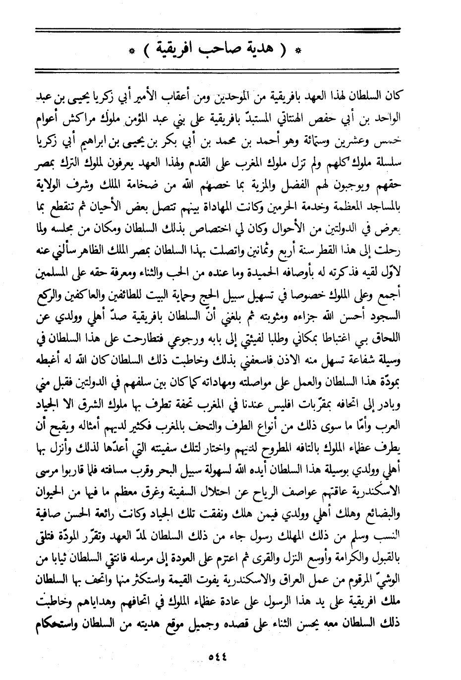كان السلطان لهذا العهد بإفريقية من الموحدين ومن أعقاب الأمير أبي زكريا يحيى بن عبد الواحد بن أبي حفص الهنتاتي المستبدّ بإفريقية على بني عبد المؤمن ملوك مراكش أعوام خمس وعشرين وستمائة وهو أحمد بن محمد بن أبي بكر بن يحيى بن إبراهيم أبي زكريا سلسلة ملوك كلهم ولم تزل ملوك المغرب على القدم ولهذا العهد يعرفون لملوك الترك بمصر حقهم ويوجبون لهم الفضل والمزية بما خصهم الله من ضخامة الملك وشرف الولاية بالمساجد المعظمة وخدمة الحرمين وكانت المهاداة بينهم تتصل بعض الأحيان ثم تنقطع بما يعرض في الدولتين من الأحوال وكان لي اختصاص بذلك السلطان ومكان من مجلسه ولما رحلت إلى هذا القطر سنة أربع وثمانين واتصلت بهذا السلطان بمصر الملك الظاهر سألني عنه لأوّل لقيه فذكرته له بأوصافه الحميدة وما عنده من الحب والثناء ومعرفة حقه على المسلمين أجمع وعلى الملوك خصوصا في تسهيل سبيل الحج وحماية البيت للطائفين والعاكفين والركع السجود أحسن الله جزاءه ومثوبته ثم بلغني أنّ السلطان بإفريقية صدّ أهلي وولدي عن اللحاق بي اغتباطا بمكاني وطلبا لفيئتي إلى بابه ورجوعي فتطارحت على هذا السلطان في وسيلة شفاعة تسهل منه الاذن فاسعفني بذلك وخاطبت ذلك السلطان كان الله له أغبطه بمودّة هذا السلطان والعمل على مواصلته ومهاداته كما كان بين سلفهم في الدولتين فقبل مني وبادر إلى اتحافه بمقرّبات أفليس عندنا في المغرب تحفة تطرف بها ملوك الشرق الا الجياد العرب وأمّا ما سوى ذلك من أنواع الطرف والتحف بالمغرب فكثير لديهم أمثاله ويقبح أن يطرف عظماء الملوك بالتافه المطروح لديهم واختار لتلك سفينته التي أعدّها لذلك وأنزل بها أهلي وولدي بوسيلة هذا السلطان أيده الله لسهولة سبيل البحر وقرب مسافته فلما قاربوا مرسى الاسكندرية عاقتهم عواصف الرياح عن احتلال السفينة وغرق معظم ما فيها من الحيوان والبضائع وهلك أهلي وولدي فيمن هلك ونفقت تلك الجياد وكانت رائعة الحسن صافية النسب وسلم من ذلك المهلك رسول جاء من ذلك السلطان لمدّ العهد وتقرّر المودّة فتلقى بالقبول والكرامة وأوسع النزل والقرى ثم اعتزم على العودة إلى مرسلة فانتقي السلطان ثيابا من الوشيّ المرقوم من عمل العراق والاسكندرية يفوت القيمة واستكثر منها واتحف بها السلطان ملك افريقية على يد هذا الرسول على عادة عظماء الملوك في اتحافهم وهداياهم وخاطبت ذلك السلطان معه يحسن الثناء على قصده وجميل موقع هديته من السلطان واستحكام