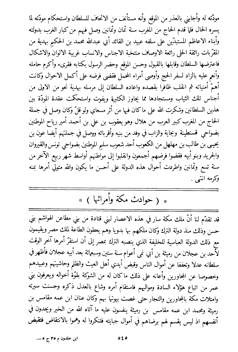 مودّته له وأجابني بالعذر من الموقع وأنه مستأنف من الإتحاف للسلطان واستحكام مودّته لما يسره الحال فلما قدم الحاج من المغرب سنة ثمان وثمانين وصل فيهم من كبار الغرب بدولته وأبناء الأعاظم المستبدّين على سلفه عبيد بن القائد أبي عبد الله محمد بن الحكيم بهدية من المقرّبات رائقة الحلي رائعة الأوصاف منتخبة الأجناس والأنساب غريبة الألوان والأشكال فاعترضها السلطان وقابلها بالقبول وحسن الموقع وحضر الرسول بكتابه فقرئ وأكرم حامله وأنعم عليه بالزاد لسفر الحج وأوصى أمراء المحمل فقضى فرضه على أكمل الأحوال وكانت أهمّ أمنياته ثم انقلب ظافرا بقصده وإعادة السلطان إلى مرسلة بهدية نحو من الاولى من أجناس تلك الثياب ومستجادها مما يجاوز الكثيرة ويفوت واستحكمت عقدة المودّة بين هذين السلطانين وشكرت الله على ما كان فيها من أثر مسعاي ولو قلّ وكان وصل في جملة الحاج من المغرب كبير العرب من هلال وهو يعقوب بن علي بن أحمد أمير رياح الموطنين بضواحي قسنطينة وبجاية والزاب في وفد من بنيه وأقربائه ووصل في جملتهم أيضا عون بن يحيى بن طالب بن مهلهل من الكعوب أحد شعوب سليم الموطنين بضواحي تونس والقيروان والجريد وبنو أبيه فقضوا فرضهم أجمعون وانقلبوا إلى مواطنهم أواسط شهر ربيع الآخر من سنة تسع وثمانين واطردت أحوال هذه الدولة على أحسن ما يكون والله متولي أمرها بمنه وكرمه انتهى.