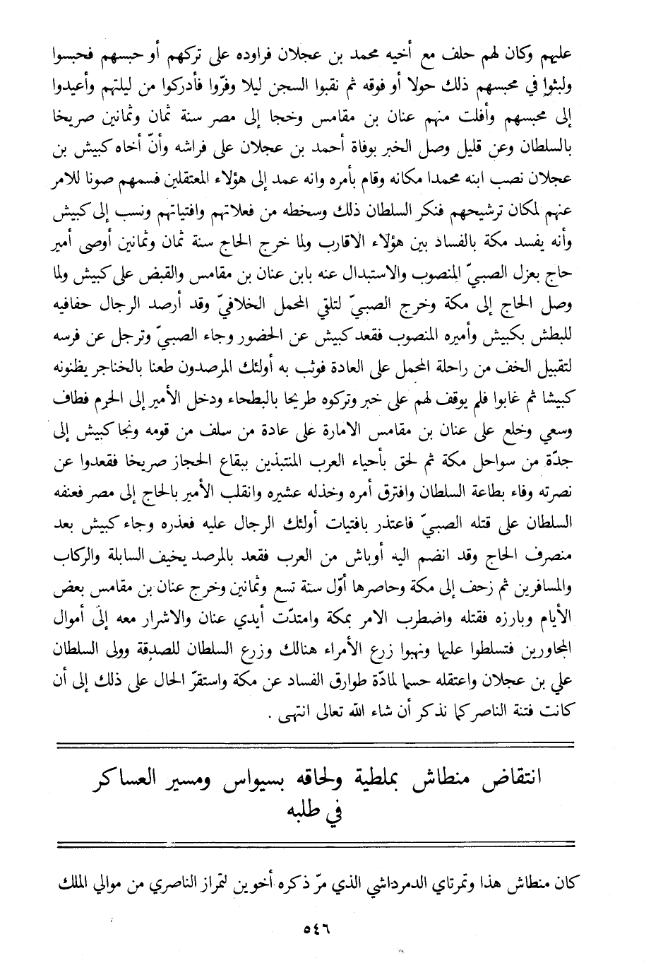 عليهم وكان لهم حلف مع أخيه محمد بن عجلان فراوده على تركهم أو حبسهم فحبسوا ولبثوا في محبسهم ذلك حولا أو فوقه ثم نقبوا السجن ليلا وفرّوا فأدركوا من ليلتهم وأعيدوا الى محبسهم وأفلت منهم عنان بن مقامس وخجا إلى مصر سنة ثمان وثمانين صريخا بالسلطان وعن قليل وصل الخبر بوفاة أحمد بن عجلان على فراشه وأنّ أخاه كبيش بن عجلان نصب ابنه محمدا مكانه وقام بأمره وانه عمد إلى هؤلاء المعتقلين فسمهم صونا للامر عنهم لمكان ترشيحهم فنكر السلطان ذلك وسخطه من فعلاتهم وافتياتهم ونسب إلى كبيش وأنه يفسد مكة بالفساد بين هؤلاء الأقارب ولما خرج الحاج سنة ثمان وثمانين أوصى أمير حاج بعزل الصبيّ المنصوب والاستبدال عنه بابن عنان بن مقامس والقبض على كبيش ولما وصل الحاج إلى مكة وخرج الصبيّ لتلقي المحمل الخلافيّ وقد أرصد الرجال حفافيه للبطش بكبيش وأميره المنصوب فقعد كبيش عن الحضور وجاء الصبيّ وترجل عن فرسه لتقبيل الخف من راحلة المحمل على العادة فوثب به أولئك المرصدون طعنا بالخناجر يظنونه كبيشا ثم غابوا فلم يوقف لهم على خبر وتركوه طريحا بالبطحاء ودخل الأمير إلى الحرم فطاف وسعي وخلع على عنان بن مقامس الامارة على عادة من سلف من قومه ونجا كبيش إلى جدّة من سواحل مكة ثم لحق بأحياء العرب المنتبذين ببقاع الحجاز صريخا فقعدوا عن نصرته وفاء بطاعة السلطان وافترق أمره وخذله عشيرة وانقلب الأمير بالحاج إلى مصر فعنفه السلطان على قتله الصبيّ فاعتذر بافتيات أولئك الرجال عليه فعذره وجاء كبيش بعد منصرف الحاج وقد انضم اليه أوباش من العرب فقعد بالمرصد يخيف السابلة والركاب والمسافرين ثم زحف إلى مكة وحاصرها أوّل سنة تسع وثمانين وخرج عنان بن مقامس بعض الأيام وبارزه فقتله واضطرب الأمر بمكة وامتدّت أيدي عنان والأشرار معه إلى أموال المجاورين فتسلطوا عليها ونهبوا زرع الأمراء هنالك وزرع السلطان للصدقة وولى السلطان علي بن عجلان واعتقله حسما لمادّة طوارق الفساد عن مكة واستقرّ الحال على ذلك إلى أن كانت فتنة الناصر كما نذكر أن شاء الله تعالى انتهى.
