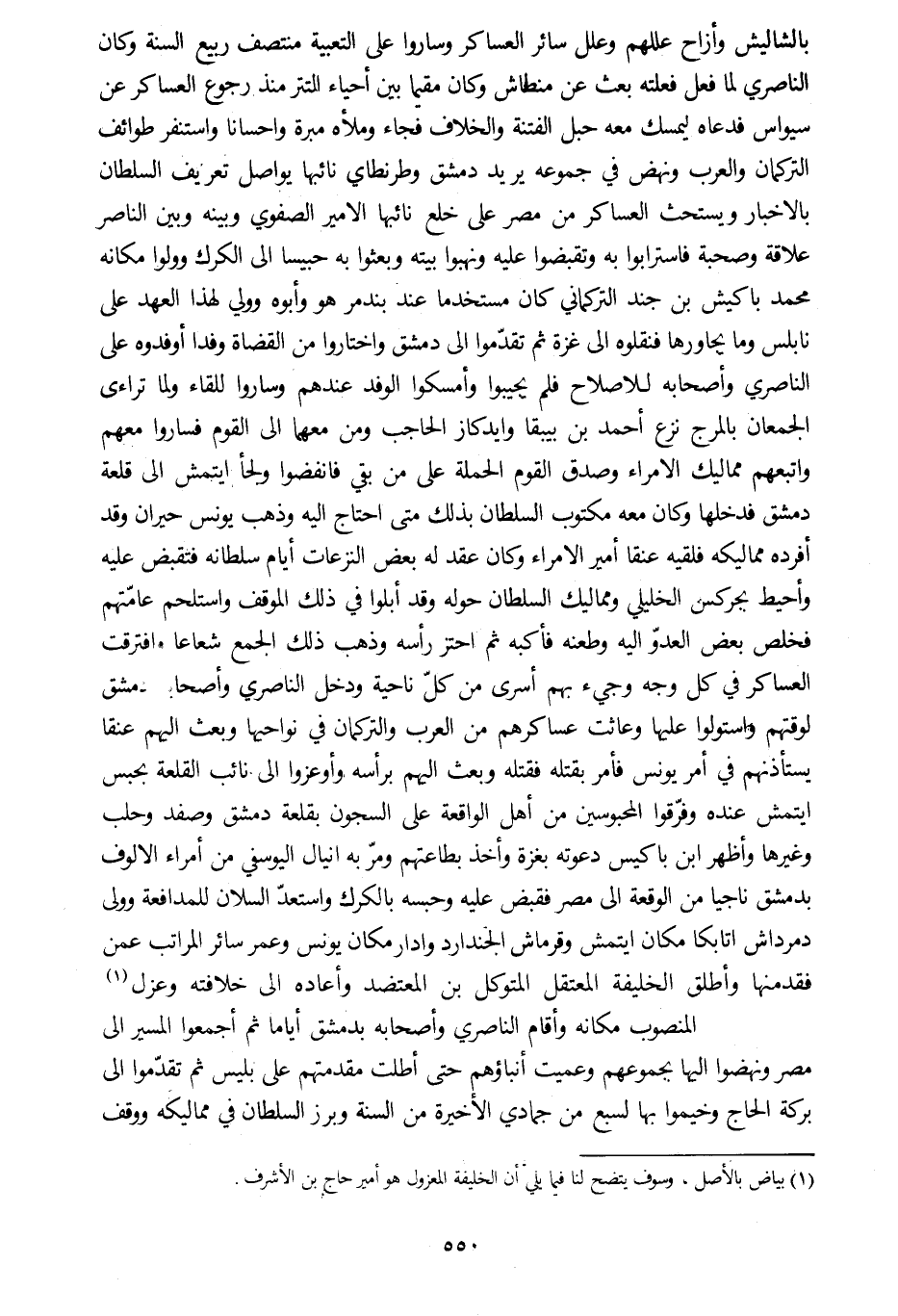 بالشاليش وأزاح عللهم وعلل سائر العساكر وساروا على التعبية منتصف ربيع السنة وكان الناصري لما فعل فعلته بعث عن منطاش وكان مقيما بين أحياء التتر منذ رجوع العساكر عن سيواس فدعاه ليمسك معه حبل الفتنة والخلاف فجاء وملأه مبرة وإحسانا واستنفر طوائف التركمان والعرب ونهض في جموعه يريد دمشق وطرنطاي نائبها يواصل تعريف السلطان بالاخبار ويستحث العساكر من مصر على خلع نائبها الأمير الصفوي وبينه وبين الناصر علاقة وصحبة فاسترابوا به وتقبضوا عليه ونهبوا بيته وبعثوا به حبيسا الى الكرك وولوا مكانه محمد باكيش بن جند التركماني كان مستخدما عند بندمر هو وأبوه وولي لهذا العهد على نابلس وما يجاورها فنقلوه الى غزة ثم تقدّموا الى دمشق واختاروا من القضاة وفدا أوفدوه على الناصري وأصحابه للإصلاح فلم يجيبوا وأمسكوا الوفد عندهم وساروا للقاء ولما تراءى الجمعان بالمرج نزع أحمد بن بيبقا وايدكاز الحاجب ومن معهما الى القوم فساروا معهم واتبعهم مماليك الأمراء وصدق القوم الحملة على من بقي فانفضوا ولجأ ايتمش الى قلعة دمشق فدخلها وكان معه مكتوب السلطان بذلك متى احتاج اليه وذهب يونس حيران وقد أفرده مماليكه فلقيه عنقا أمير الأمراء وكان عقد له بعض النزعات أيام سلطانه فتقبض عليه وأحيط بجركس الخليلي ومماليك السلطان حوله وقد أبلوا في ذلك الموقف واستلحم عامّتهم فخلص بعض العدوّ اليه وطعنه فأكبه ثم احتز رأسه وذهب ذلك الجمع شعاعا وافترقت العساكر في كل وجه وجيء بهم أسرى من كلّ ناحية ودخل الناصري وأصحابه دمشق لوقتهم واستولوا عليها وعاثت عساكرهم من العرب والتركمان في نواحيها وبعث اليهم عنقا يستأذنهم في أمر يونس فأمر بقتله فقتله وبعث اليهم برأسه وأوعزوا الى نائب القلعة بحبس ايتمش عنده وفرّقوا المحبوسين من أهل الواقعة على السجون بقلعة دمشق وصفد وحلب وغيرها وأظهر ابن باكيش دعوته بغزة وأخذ بطاعتهم ومرّ به انيال اليوسفي من أمراء الألوف بدمشق ناجيا من الوقعة الى مصر فقبض عليه وحبسه بالكرك واستعدّ السلان للمدافعة وولى دمرداش اتابكا مكان ايتمش وقرماش الجندار دوادار مكان يونس وعمر سائر المراتب عمن فقد منها وأطلق الخليفة المعتقل المتوكل بن المعتضد وأعاده الى خلافته وعزل [1] المنصوب مكانه وأقام الناصري وأصحابه بدمشق أياما ثم أجمعوا المسير الى مصر ونهضوا اليها بجموعهم وعميت أنباؤهم حتى أطلت مقدمتهم على بليس ثم تقدّموا الى بركة الحاج وخيموا بها لسبع من جمادى الأخيرة من السنة وبرز السلطان في مماليكه ووقف