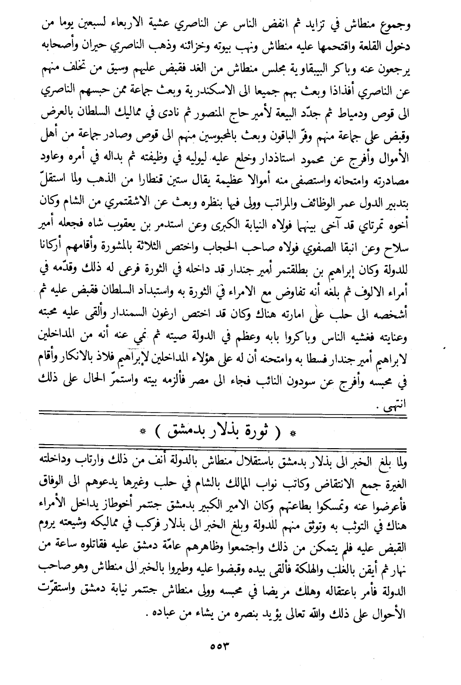 ولما بلغ الخبر الى بذلار بدمشق باستقلال منطاش بالدولة أنف من ذلك وارتاب وداخلته الغيرة جمع الانتقاض وكاتب نواب الممالك بالشام في حلب وغيرها يدعوهم الى الوفاق فأعرضوا عنه وتمسكوا بطاعتهم وكان الأمير الكبير بدمشق جنتمر أخوطاز يداخل الأمراء هناك في التوثب به وتوثق منهم للدولة وبلغ الخبر الى بذلار فركب في مماليكه وشيعته يروم القبض عليه فلم يتمكن من ذلك واجتمعوا وظاهرهم عامّة دمشق عليه فقاتلوه ساعة من نهار ثم أيقن بالغلب والهلكة فألقى بيده وقبضوا عليه وطيروا بالخبر الى منطاش وهو صاحب الدولة فأمر باعتقاله وهلك مريضا في محبسه وولى منطاش جنتمر نيابة دمشق واستقرّت الأحوال على ذلك والله تعالى يؤيد بنصره من يشاء من عباده