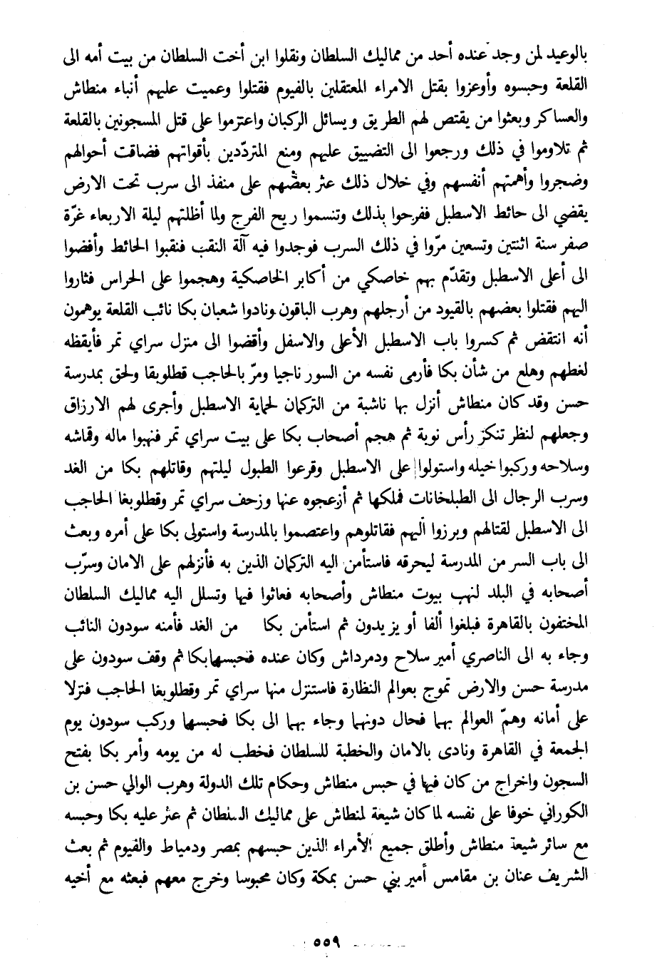 بالوعيد لمن وجد عنده أحد من مماليك السلطان ونقلوا ابن أخت السلطان من بيت أمه الى القلعة وحبسوه وأوعزوا بقتل الأمراء المعتقلين بالفيوم فقتلوا وعميت عليهم أنباء منطاش والعساكر وبعثوا من يقتص لهم الطريق ويسائل الركبان واعتزموا على قتل المسجونين بالقلعة ثم تلاوموا في ذلك ورجعوا الى التضييق عليهم ومنع المتردّدين بأقواتهم فضاقت أحوالهم وضجروا وأهمتهم أنفسهم وفي خلال ذلك عثر بعضهم على منفذ الى سرب تحت الأرض يقضي الى حائط الاسطبل ففرحوا بذلك وتنسموا ريح الفرج ولما أظلتهم ليلة الأربعاء غرّة صفر سنة اثنتين وتسعين مرّوا في ذلك السرب فوجدوا فيه آلة النقب فنقبوا الحائط وأفضوا الى أعلى الاسطبل وتقدّم بهم خاصكي من أكابر الخاصكية وهجموا على الحراس فثاروا اليهم فقتلوا بعضهم بالقيود من أرجلهم وهرب الباقون ونادوا شعبان بكا نائب القلعة يوهمون أنه انتقض ثم كسروا باب الاسطبل الأعلى والأسفل وأفضوا الى منزل سراي تمر فأيقظه لغطهم وهلع من شأن بكا فأرمى نفسه من السور ناجيا ومرّ بالحاجب قطلوبقا ولحق بمدرسة حسن وقد كان منطاش أنزل بها ناشبة من التركمان لحماية الاسطبل وأجرى لهم الأرزاق وجعلهم لنظر تنكز رأس نوبة ثم هجم أصحاب بكا على بيت سراي تمر فنهبوا ماله وقماشه وسلاحه وركبوا خيله واستولوا على الاسطبل وقرعوا الطبول ليلتهم وقاتلهم بكا من الغد وسرب الرجال الى الطبلخانات فملكها ثم أزعجوه عنها وزحف سراي تمر وقطلوبغا الحاجب الى الاسطبل لقتالهم وبرزوا اليهم فقاتلوهم واعتصموا بالمدرسة واستولى بكا على أمره وبعث الى باب السر من المدرسة ليحرقه فاستأمن اليه التركمان الذين به فأنزلهم على الأمان وسرّب أصحابه في البلد لنهب بيوت منطاش وأصحابه فعاثوا فيها وتسلل اليه مماليك السلطان المختفون بالقاهرة فبلغوا ألفا أو يزيدون ثم استأمن بكا من الغد فأمنه سودون النائب وجاء به الى الناصري أمير سلاح ودمرداش وكان عنده فحبسهما بكا ثم وقف سودون على مدرسة حسن والأرض تموج بعوالم النظارة فاستنزل منها سراي تمر وقطلوبغا الحاجب فنزلا على أمانه وهمّ العوالم بهما فحال دونهما وجاء بهما الى بكا فحبسهما وركب سودون يوم الجمعة في القاهرة ونادى بالأمان والخطبة للسلطان فخطب له من يومه وأمر بكا بفتح السجون وإخراج من كان فيها في حبس منطاش وحكام تلك الدولة وهرب الوالي حسن بن الكوراني خوفا على نفسه لما كان شيعة لمنطاش على مماليك السلطان ثم عثر عليه بكا وحبسه مع سائر شيعة منطاش وأطلق جميع الأمراء الذين حبسهم بمصر ودمياط والفيوم ثم بعث الشريف عنان بن مقامس أمير بني حسن بمكة وكان محبوسا وخرج معهم فبعثه مع أخيه