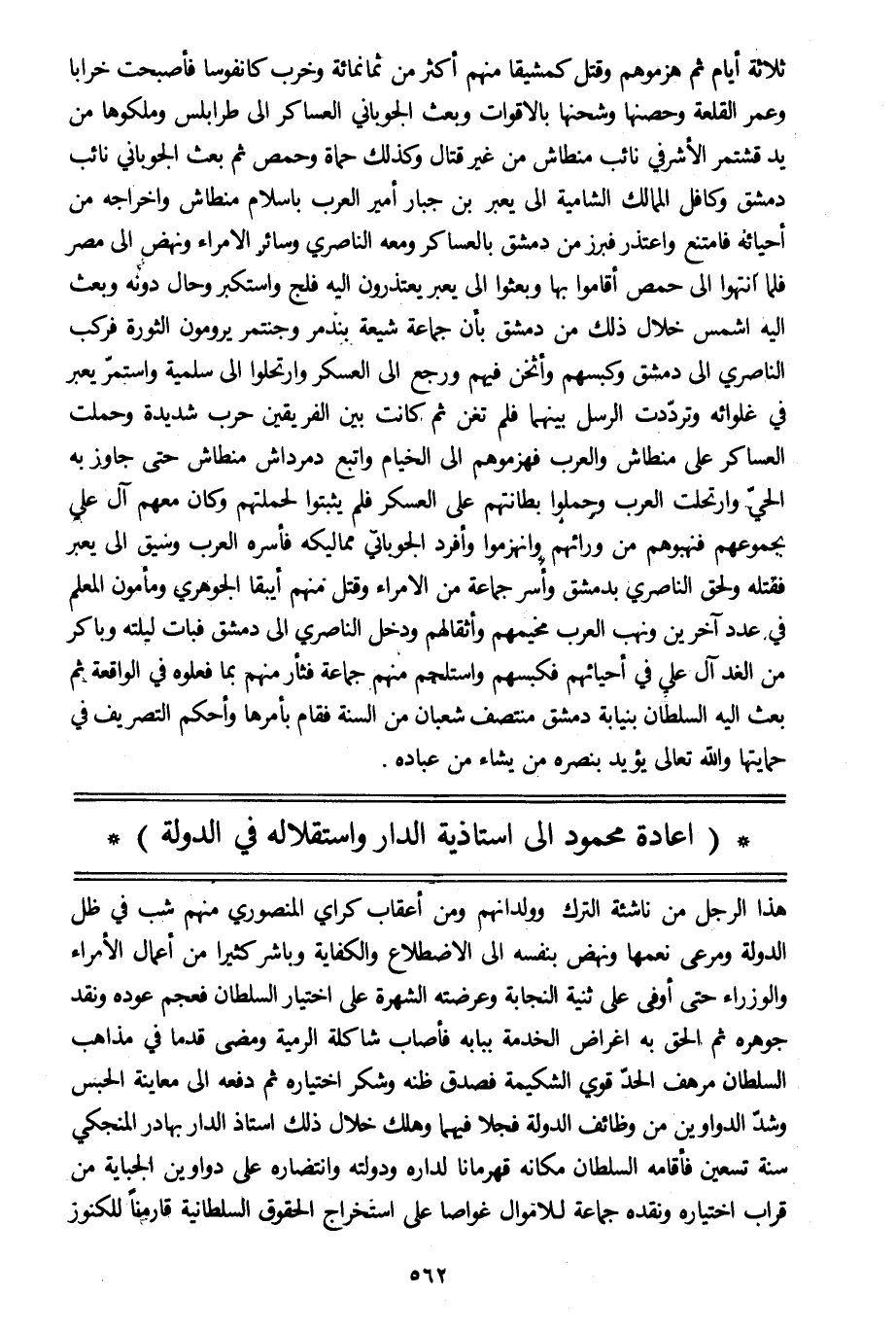 ثلاثة أيام ثم هزموهم وقتل كمشيقا منهم أكثر من ثمانمائة وخرب كانفوسا فأصبحت خرابا وعمر القلعة وحصنها وشحنها بالأقوات وبعث الجوباني العساكر الى طرابلس وملكوها من يد قشتمر الأشرفي نائب منطاش من غير قتال وكذلك حماة وحمص ثم بعث الجوباني نائب دمشق وكافل الممالك الشامية الى يعبر بن جبار أمير العرب بإسلام منطاش وإخراجه من أحيائه فامتنع واعتذر فبرز من دمشق بالعساكر ومعه الناصري وسائر الأمراء ونهض الى مصر فلما انتهوا الى حمص أقاموا بها وبعثوا الى يعبر يعتذرون اليه فلج واستكبر وحال دونه وبعث اليه اشمس خلال ذلك من دمشق بأن جماعة شيعة بندمر وجنتمر يرومون الثورة فركب الناصري الى دمشق وكبسهم وأثخن فيهم ورجع الى العسكر وارتحلوا الى سلمية واستمرّ يعبر في غلوائه وتردّدت الرسل بينهما فلم تغن ثم كانت بين الفريقين حرب شديدة وحملت العساكر على منطاش والعرب فهزموهم الى الخيام واتبع دمرداش منطاش حتى جاوز به الحيّ وارتحلت العرب وحملوا بطانتهم على العسكر فلم يثبتوا لحملتهم وكان معهم آل على بجموعهم فنهبوهم من ورائهم وانهزموا وأفرد الجوباني مماليكه فأسره العرب وسيق الى يعبر فقتله ولحق الناصري بدمشق وأسر جماعة من الأمراء وقتل منهم أيبقا الجوهري ومأمون المعلم في عدد آخرين ونهب العرب مخيمهم وأثقالهم ودخل الناصري الى دمشق فبات ليلته وباكر من الغد آل علي في أحيائهم فكبسهم واستلحم منهم جماعة فثأر منهم بما فعلوه في الواقعة ثم بعث اليه السلطان بنيابة دمشق منتصف شعبان من السنة فقام بأمرها وأحكم التصريف في حمايتها والله تعالى يؤيد بنصره من يشاء من عباده.