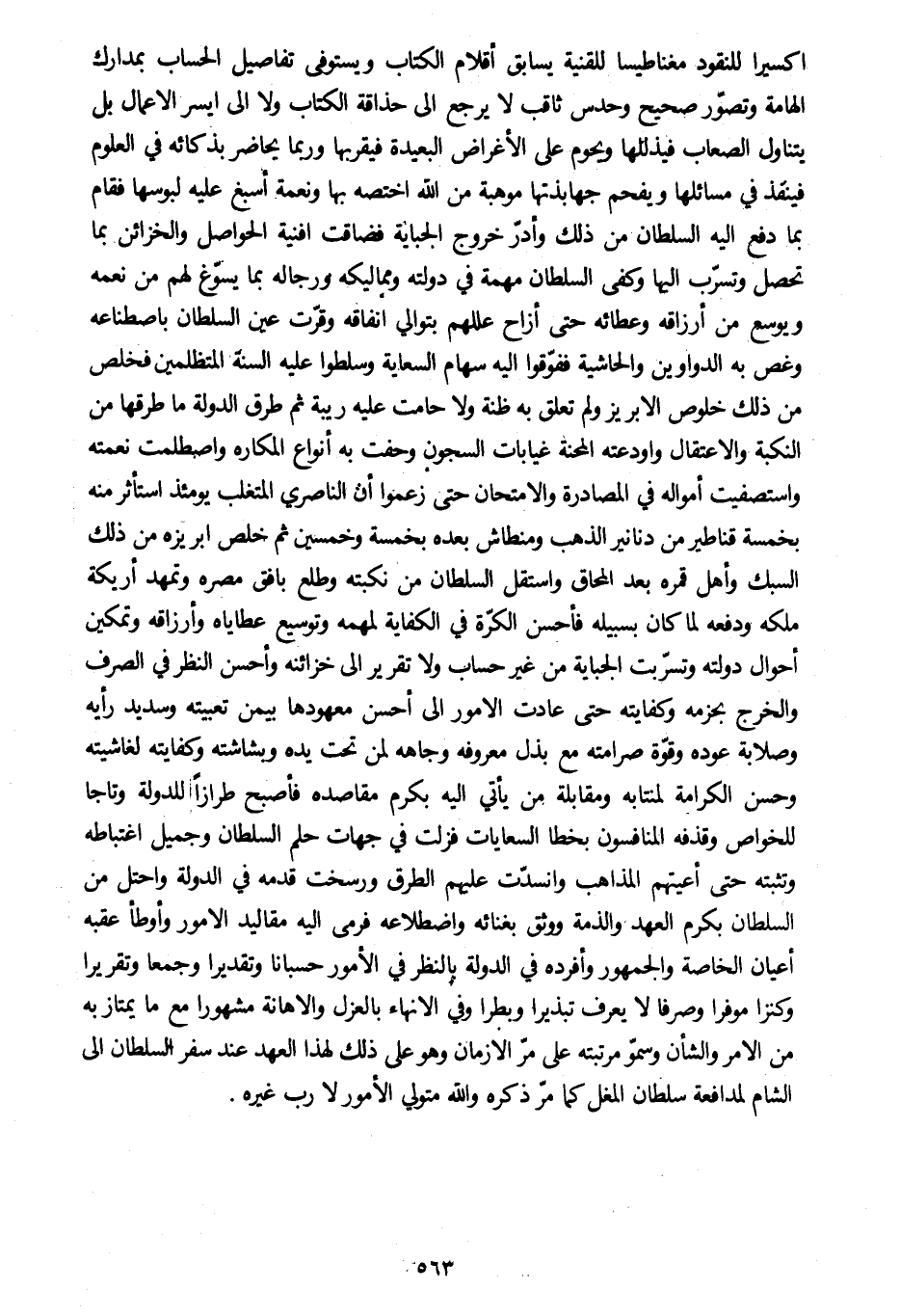 اكسيرا للنقود مغناطيسا للقنية يسابق أقلام الكتاب ويستوفي تفاصيل الحساب بمدارك الهامة وتصوّر صحيح وحدس ثاقب لا يرجع الى حذاقة الكتاب ولا الى أيسر الأعمال بل يتناول الصعاب فيذللها ويحوم على الأغراض البعيدة فيقربها وربما يحاضر بذكائه في العلوم فينفذ في مسائلها ويفحم جهابذتها موهبة من الله اختصه بها ونعمة أسبغ عليه لبوسها فقام بما دفع اليه السلطان من ذلك وأدرّ خروج الجباية فضاقت افنية الحواصل والخزائن بما تحصل وتسرّب اليها وكفى السلطان مهمة في دولته ومماليكه ورجاله بما يسوّغ لهم من نعمه ويوسع من أرزاقه وعطائه حتى أزاح عللهم بتوالي إنفاقه وقرّت عين السلطان باصطناعه وغص به الدواوين والحاشية ففوّقوا اليه سهام السعاية وسلطوا عليه السنة المتظلمين فخلص من ذلك خلوص الإبريز ولم تعلق به ظنة ولا حامت عليه ريبة ثم طرق الدولة ما طرقها من النكبة والاعتقال وأودعته المحنة غيابات السجون وحفت به أنواع المكاره واصطلمت نعمته واستصفيت أمواله في المصادرة والامتحان حتى زعموا أن الناصري المتغلب يومئذ استأثر منه بخمسة قناطير من دنانير الذهب ومنطاش بعده بخمسة وخمسين ثم خلص ابريزه من ذلك السبك وأهل قمره بعد المحاق واستقل السلطان من نكبته وطلع بأفق مصره وتمهد أريكة ملكه ودفعه لما كان بسبيله فأحسن الكرّة في الكفاية لمهمه وتوسيع عطاياه وأرزاقه وتمكين أحوال دولته وتسرّيت الجباية من غير حساب ولا تقرير الى خزائنه وأحسن النظر في الصرف والخرج بحزمه وكفايته حتى عادت الأمور الى أحسن معهودها بيمن تعبيته وسديد رأيه وصلابة عوده وقوّه صرامته مع بذل معروفه وجاهه لمن تحت يده وبشاشته وكفايته لغاشيته وحسن الكرامة لمنتابه ومقابلة من يأتي اليه بكرم مقاصده فأصبح طرازا للدولة وتاجا للخواص وقذفه المنافسون بخطإ العسايات فزلت في جهات حلم السلطان وجميل اغتباطه وتثبته حتى أعيتهم المذاهب وانسدّت عليهم الطرق ورسخت قدمه في الدولة واحتل من السلطان بكرم العهد والذمة ووثق بغنائه واضطلاعه فرمى اليه مقاليد الأمور وأوطأ عقبه أعيان الخاصة والجمهور وأفرده في الدولة بالنظر في الأمور حسبانا وتقديرا وجمعا وتقريرا وكنزا موفرا وصرفا لا يعرف تبذيرا وبطرا وفي الإنهاء بالعزل والإهانة مشهورا مع ما يمتاز به من الأمر والشأن وسموّ مرتبته على مرّ الأزمان وهو على ذلك لهذا العهد عند سفر السلطان الى الشام لمدافعة سلطان المغل كما مرّ ذكره والله متولي الأمور لا رب غيره