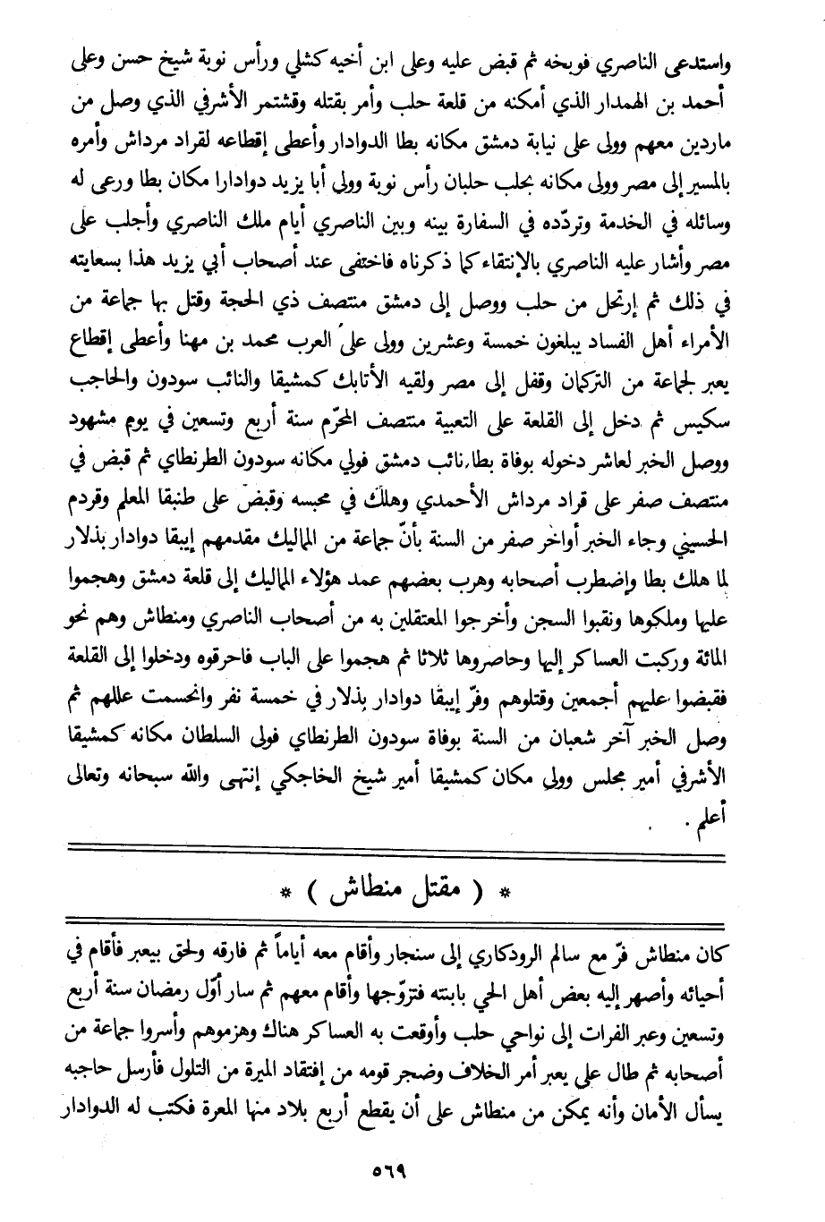 واستدعى الناصري فوبخه ثم قبض عليه وعلى ابن أخيه كشلي ورأس نوبة شيخ حسن وعلى أحمد بن الهمدار الّذي أمكنه من قلعة حلب وأمر بقتله وقشتمر الأشرفي الّذي وصل من ماردين معهم وولى على نيابة دمشق مكانه بطا الدوادار وأعطى إقطاعه لقراد مرداش وأمره بالمسير إلى مصر وولى مكانه بحلب حلبان رأس نوبة وولى أبا يزيد دوادارا مكان بطا ورعى له وسائله في الخدمة وتردّده في السفارة بينه وبين الناصري أيام ملك الناصري وأجلب على مصر وأشار عليه الناصري بالانتقاء كما ذكرناه فاختفى عند أصحاب أبي يزيد هذا بسعايته في ذلك ثم ارتحل من حلب ووصل إلى دمشق منتصف ذي الحجة وقتل بها جماعة من الأمراء أهل الفساد يبلغون خمسة وعشرين وولى على العرب محمد بن مهنا وأعطى إقطاع يعبر لجماعة من التركمان وقفل إلى مصر ولقيه الأتابك كمشيقا والنائب سودون والحاجب سكيس ثم دخل إلى القلعة على التعبية منتصف المحرّم سنة أربع وتسعين في يوم مشهود ووصل الخبر لعاشر دخوله بوفاة بطا نائب دمشق فولي مكانه سودون الطرنطاي ثم قبض في منتصف صفر على قراد مرداش الأحمدي وهلك في محبسه وقبض على طنبقا المعلم وقردم الحسيني وجاء الخبر أواخر صفر من السنة بأنّ جماعة من المماليك مقدمهم إيبقا دوادار بذلار لما هلك بطا واضطرب أصحابه وهرب بعضهم عمد هؤلاء المماليك إلى قلعة دمشق وهجموا عليها وملكوها ونقبوا السجن وأخرجوا المعتقلين به من أصحاب الناصري ومنطاش وهم نحو المائة وركبت العساكر إليها وحاصروها ثلاثا ثم هجموا على الباب فأحرقوه ودخلوا إلى القلعة فقبضوا عليهم أجمعين وقتلوهم وفرّ إيبقا دوادار بذلار في خمسة نفر وانحسمت عللهم ثم وصل الخبر آخر شعبان من السنة بوفاة سودون الطرنطاي فولى السلطان مكانه كمشيقا الأشرفي أمير مجلس وولى مكان كمشيقا أمير شيخ الخاجكي انتهى والله سبحانه وتعالى أعلم.