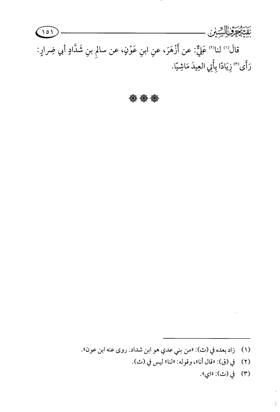 قالَ (¬١) لنا (¬٢) عِليٌّ: عن أَزْهَرَ، عنِ ابنِ عَوْنٍ، عن سالمِ بنِ شَدَّادٍ أبي ضِرارٍ: رَأَى (¬٣) زِيادًا يأْتِي العِيدَ مَاشِيًا.