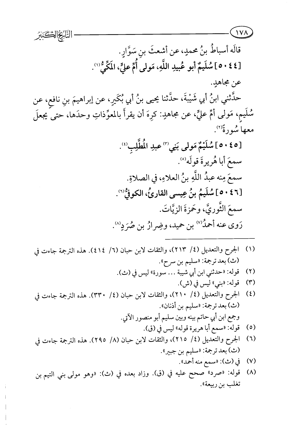 (¬٤) الجرح والتعديل (٤/ ٢١٠)، والثقات لابن حبان (٤/ ٣٣٠). هذه الترجمة جاءت فى (ث) بعد ترجمة: "سليم بن أذنان".