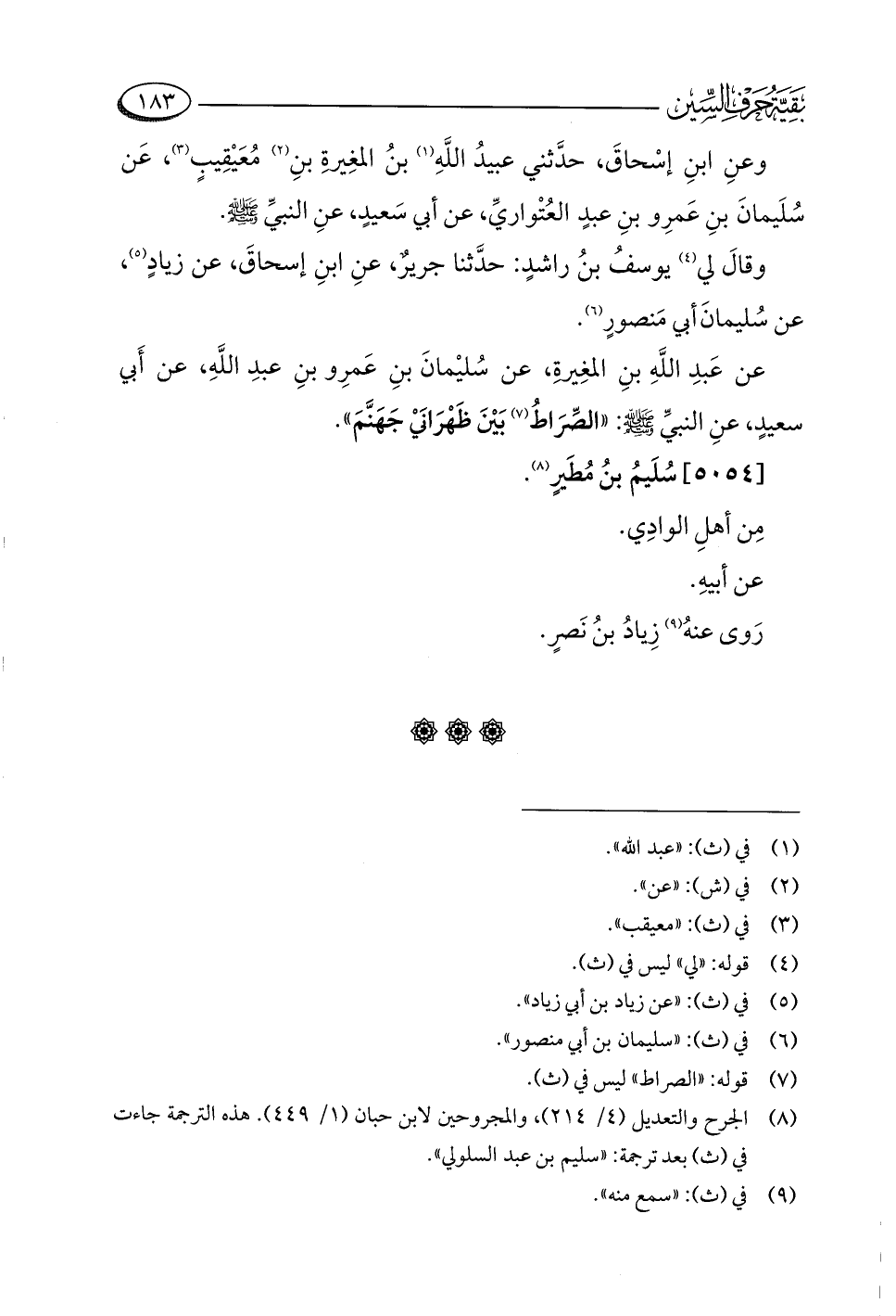 عن عَبدِ اللَّهِ بنِ المغِيرةِ، عن سُليْمانَ بنِ عَمرِو بنِ عبدِ اللَّهِ، عن أَبي سعيدٍ، عنِ النبيِّ -صلى اللَّه عليه وسلم-: "الصِّرَاطُ (¬٧) بَيْنَ ظَهْرَانَيْ جَهَنَّمَ".