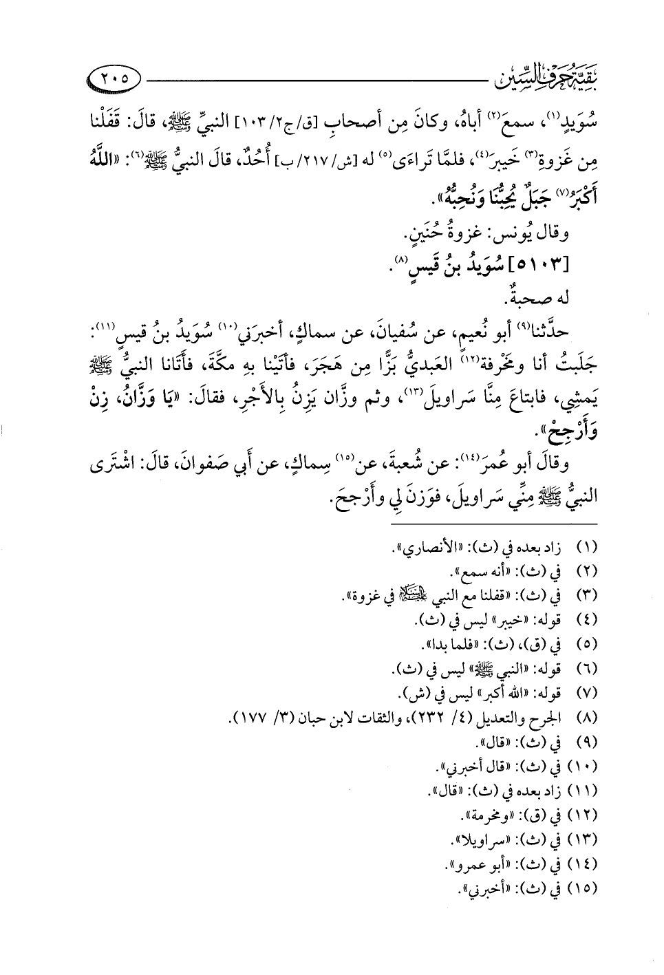 حدَّثنا (¬٩) أبو نُعيمٍ، عن سُفيانَ، عن سماكٍ، أخبرَني (¬١٠) سُوَيدُ بنُ قيسٍ (¬١١): جَلَبتُ أنا ومَخْرفة (¬١٢) العَبديُّ بَزًّا مِن هَجَرَ، فأتَيْنا بهِ مكَّةَ، فأتَانا النبيُّ -صلى اللَّه عليه وسلم- يَمشِي، فابتاعَ مِنَّا سراويلَ (¬١٣)، وثم وزَّان يَزِنُ بِالأَجْرِ، فقالَ: "يَا وَزَّانُ، زِنْ وَأَرْجِحْ".