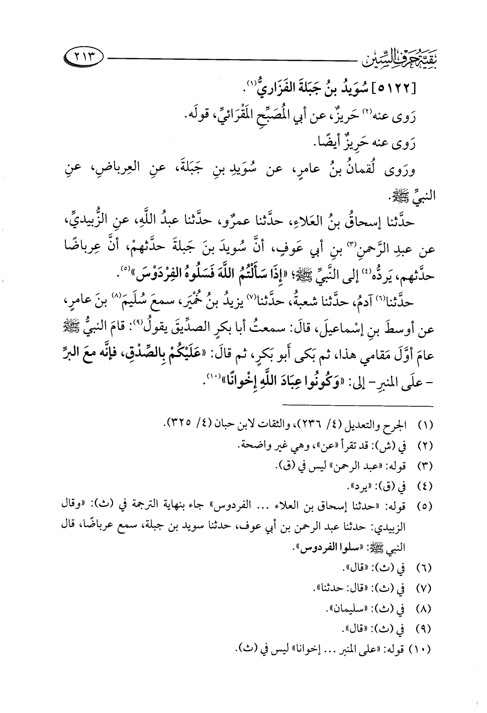 (¬٥) قوله: "حدثنا إسحاق بن العلاء. . . الفردوس" جاء بنهاية الترجمة في (ث): "وقال الزبيدي: حدثنا عبد الرحمن بن أبي عوف، حدثنا سويد بن جبلة، سمع عرباضًا، قال النبي -صلى اللَّه عليه وسلم-: "سلوا الفردوس".