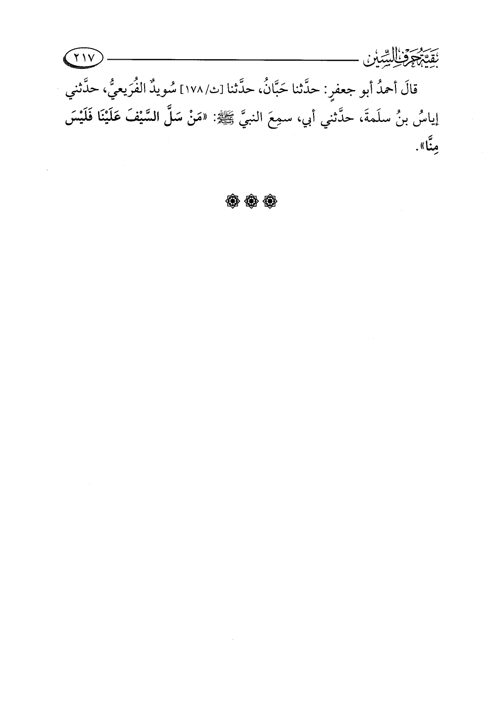 قالَ أحمدُ أبو جعفرٍ: حدَّثنا حَبَّانُ، حدَّثنا سُويدٌ الفُرَيعيُّ، حدَّثني إياسُ بنُ سلَمةَ، حدَّثني أبي، سمِعَ النبيَّ -صلى اللَّه عليه وسلم-: "مَنْ سَلَّ السَّيْفَ عَلَيْنَا فَلَيْسَ مِنَّا".