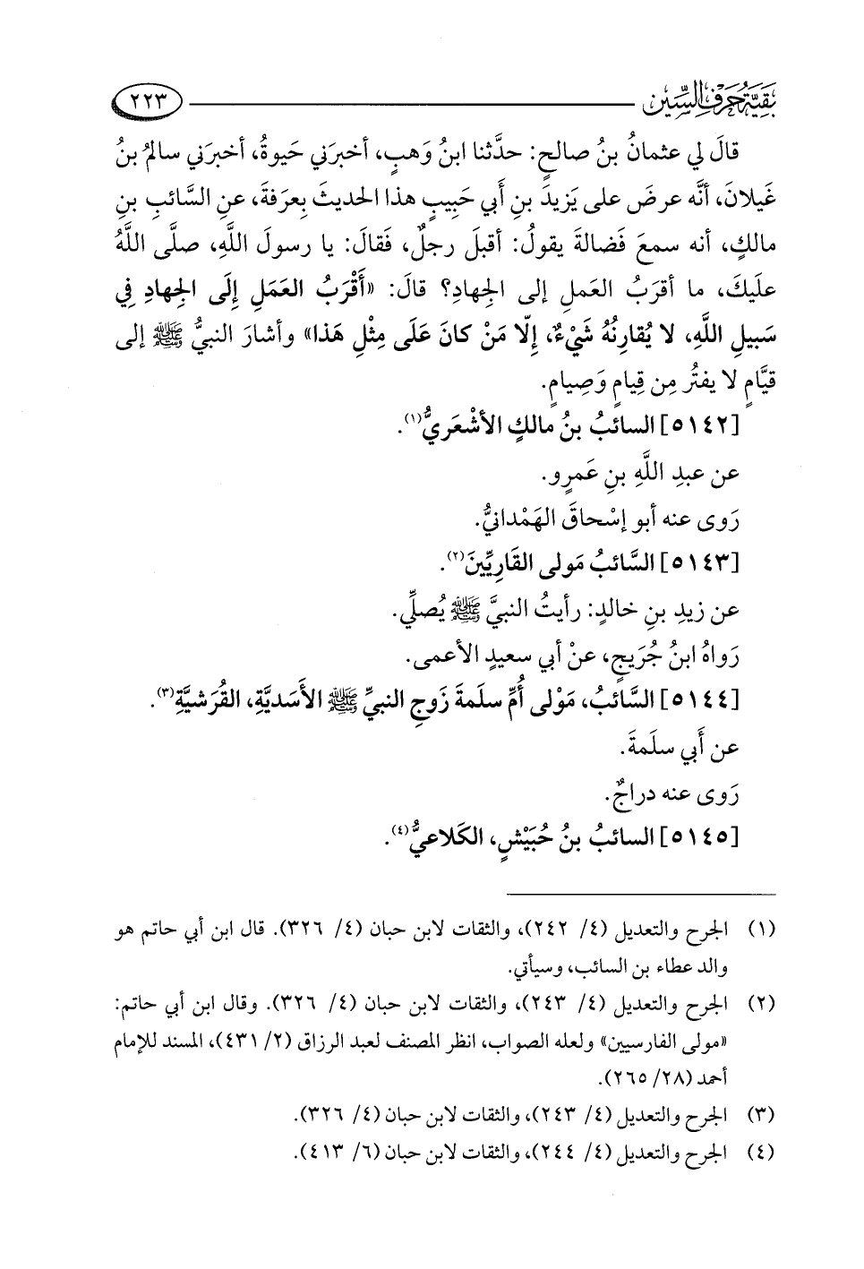 (¬١) الجرح والتعديل (٤/ ٢٤٢)، والثقات لابن حبان (٤/ ٣٢٦). قال ابن أبي حاتم هو والد عطاء بن السائب، وسيأتي.