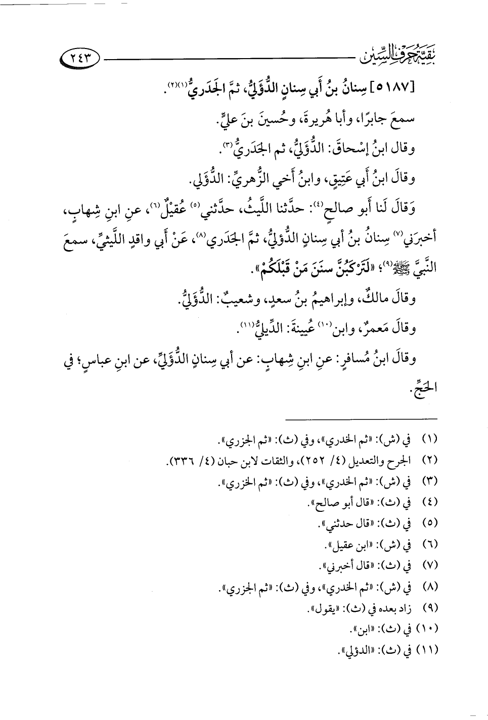 [٥١٨٧] سِنانُ بنُ أَبي سِنانٍ الدُّؤَليُّ، ثمَّ الجَدَريُّ (¬١) (¬٢).