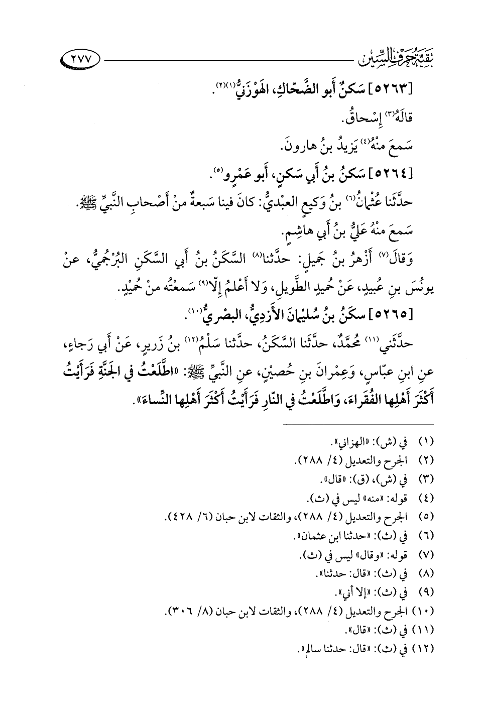 حدَّثَني (¬١١) مُحمَّدٌ، حدَّثَنا السَّكَنُ، حدَّثنا سَلْمُ (¬١٢) بنُ زَريرٍ، عَنْ أَبي رَجاءٍ، عنِ ابنِ عبّاسٍ، وَعِمْرانَ بنِ حُصيْنٍ، عنِ النَّبيِّ -صلى اللَّه عليه وسلم-: "اطَّلَعْتُ في الجَنَّةِ فَرَأَيْتُ أَكْثَرَ أَهْلِها الفُقَراءَ، وَاطَّلَعْتُ في النّارِ فَرَأَيْتُ أَكثَرَ أَهْلِها النِّساءَ".