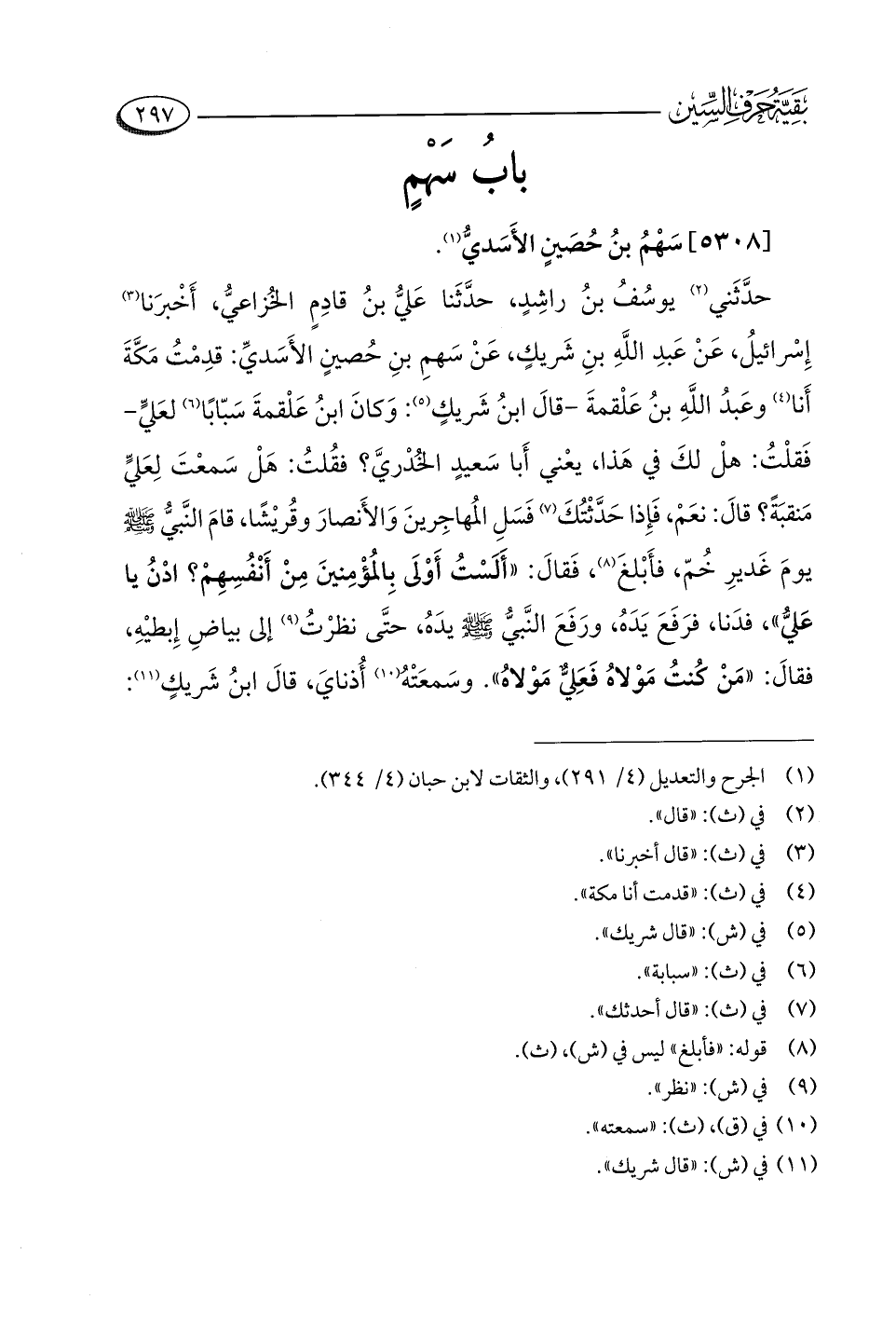 حدَّثَني (¬٢) يوسُفُ بنُ راشِدٍ، حدَّثَنا عَليُّ بنُ قادِمٍ الخُزاعيُّ، أَخْبرَنا (¬٣) إِسْرائيلُ، عَنْ عَبدِ اللَّهِ بنِ شَريكٍ، عَنْ سَهمِ بنِ حُصينٍ الأَسَديِّ: قدِمْتُ مَكَّةَ أَنا (¬٤) وعَبدُ اللَّهِ بنُ عَلْقمةَ -قالَ ابنُ شريكٍ (¬٥): وَكانَ ابنُ عَلْقمةَ سَبّابًا (¬٦) لعَليٍّ- فَقلْتُ: هلْ لكَ في هَذا، يعْني أَبا سَعيدٍ الخُدْريَّ؟ فقُلتُ: هَلْ سَمعْتَ لِعَليٍّ مَنقبَةً؟ قالَ: نعَمْ، فَإِذا حَدَّثْتُكَ (¬٧) فَسَلِ المُهاجِرينَ وَالأَنصارَ وقُريْشًا، قامَ النَّبيُّ -صلى اللَّه عليه وسلم- يومَ غَديرِ خُمّ، فأَبْلغَ (¬٨)، فَقالَ: "أَلَسْتُ أَوْلَى بِالمُؤْمِنينَ مِنْ أَنْفُسِهِمْ؟ ادْنُ يا عَليُّ"، فدَنا، فرَفَعَ يَدَهُ، ورَفَعَ النَّبيُّ -صلى اللَّه عليه وسلم- يدَهُ، حتَّى نظرْتُ (¬٩) إلى بياضِ إِبطيْهِ، فقالَ: "مَنْ كُنتُ مَوْلاهُ فَعَليٌّ مَوْلاهُ". وسَمعَتْهُ (¬١٠) أُذنايَ، قالَ ابنُ شَريكٍ (¬١١):