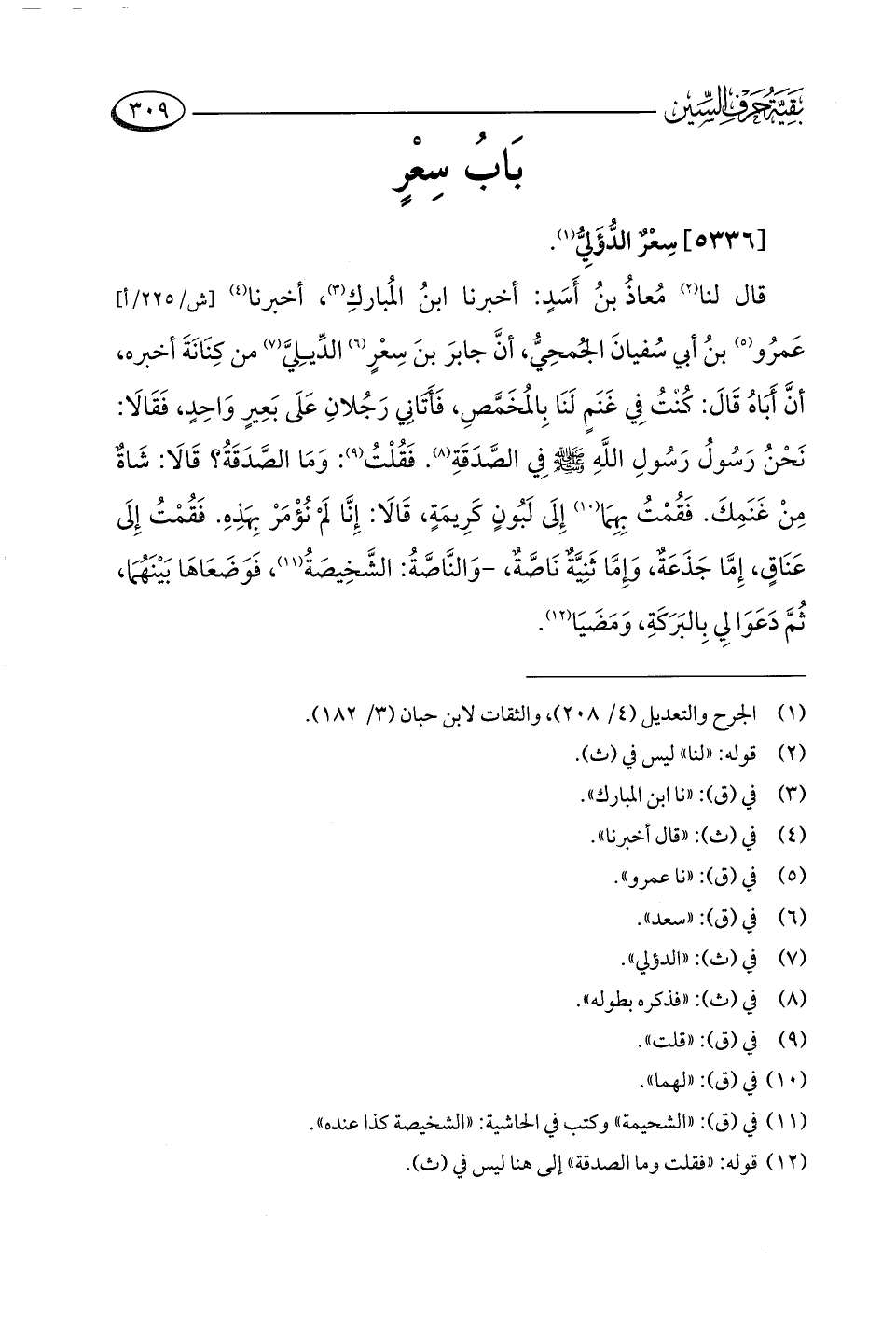 قال لنا (¬٢) مُعاذُ بنُ أَسَدٍ: أخبرنا ابنُ المُباركِ (¬٣)، أخبرنا (¬٤) عَمرُو (¬٥) بنُ أبي سُفيانَ الجُمحِيُّ، أنَّ جابرَ بنَ سِعْرٍ (¬٦) الدِّيِليَّ (¬٧) من كِنَانَةَ أخبره، أنَّ أَبَاهُ قَالَ: كُنْتُ فِي غَنَمٍ لَنَا بِالمُخَمَّصِ، فَأَتَانِي رَجُلانِ عَلَى بَعِيرٍ وَاحِدٍ، فَقَالَا: نَحْنُ رَسُولُ رَسُولِ اللَّهِ -صلى اللَّه عليه وسلم- فِي الصَّدَقَةِ (¬٨). فَقُلْتُ (¬٩): وَمَا الصَّدَقَةُ؟ قَالَا: شَاةٌ مِنْ غَنَمِكَ. فَقُمْتُ بِهِمَا (¬١٠) إِلَى لَبُونٍ كَرِيمَةٍ، قَالَا: إِنَّا لَمْ نُؤْمَرْ بِهَذِهِ. فَقُمْتُ إِلَى عَنَاقٍ، إِمَّا جَذَعَةٌ، وَإِمَّا ثَنِيَّةٌ نَاصَّةٌ، -وَالنَّاصَّةُ: الشَّخِيصَةُ (¬١١)، فَوَضَعَاهَا بَيْنَهُمَا، ثُمَّ دَعَوَا لِي بِالبَرَكَةِ، وَمَضَيَا (¬١٢).