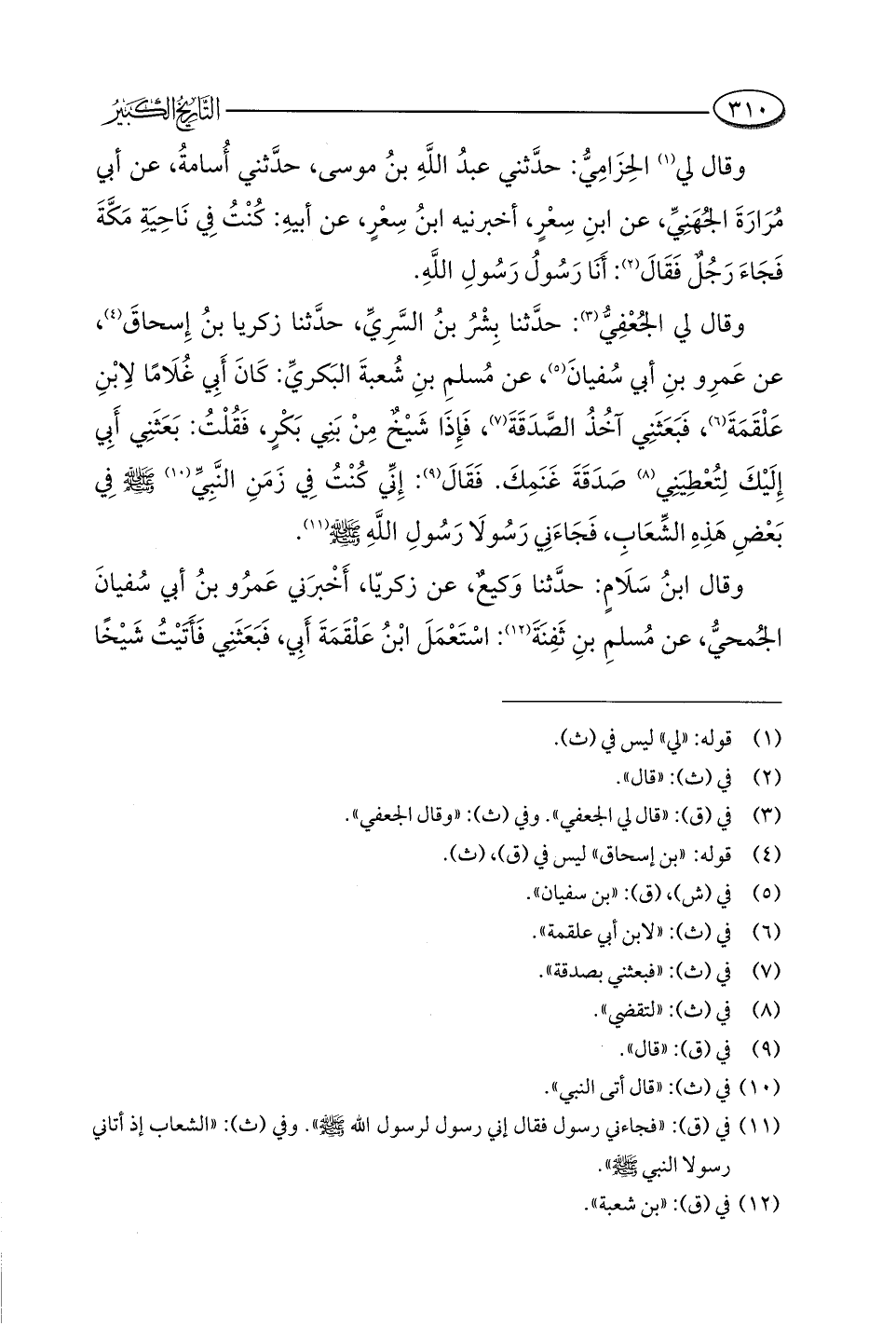 وقال لي الجُعْفِيُّ (¬٣): حدَّثنا بِشْرُ بنُ السَّرِيِّ، حدَّثنا زكريا بنُ إِسحاقَ (¬٤)، عن عَمرِو بنِ أبي سُفيانَ (¬٥)، عن مُسلمِ بنِ شُعبةَ البَكريِّ: كَانَ أَبِي غُلَامًا لِابْنِ عَلْقَمَةَ (¬٦)، فَبَعَثَنِي آخُذُ الصَّدَقَةَ (¬٧)، فَإِذَا شَيْخٌ مِنْ بَنِي بَكْرٍ، فَقُلْتُ: بَعَثَنِي أَبِي إِلَيْكَ لِتُعْطِيَنِي (¬٨) صَدَقَةَ غَنَمِكَ. فَقَالَ (¬٩): إِنِّي كُنْتُ فِي زَمَنِ النَّبِيِّ (¬١٠) -صلى اللَّه عليه وسلم- فِي بَعْضِ هَذِهِ الشِّعَابِ، فَجَاءَنِي رَسُولَا رَسُولِ اللَّهِ -صلى اللَّه عليه وسلم- (¬١١).