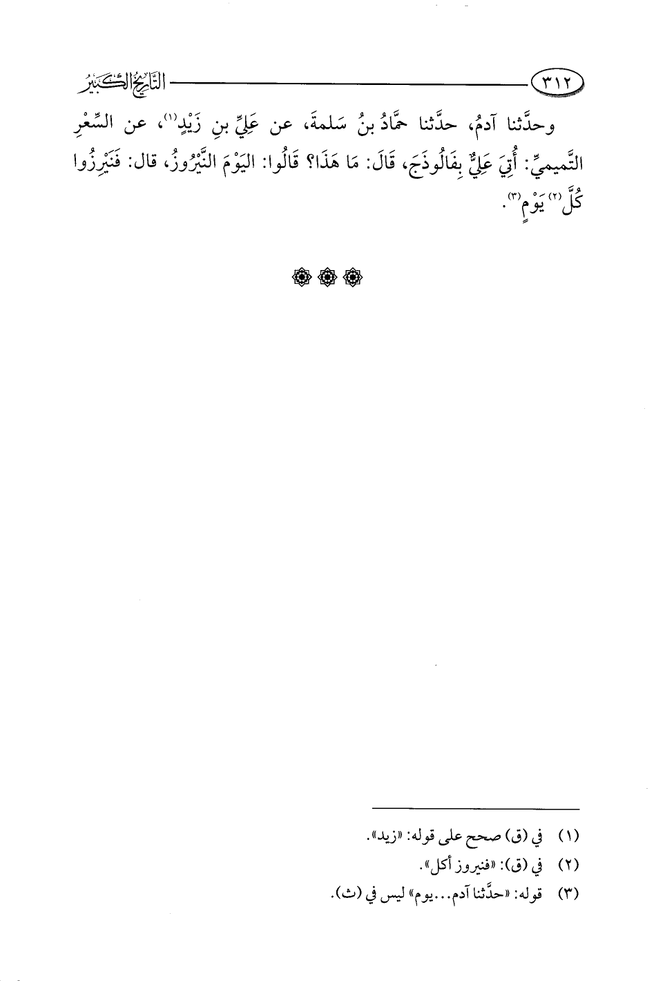 وحدَّثنا آدمُ، حدَّثنا حمَّادُ بنُ سَلمةَ، عن عَليِّ بنِ زَيْدٍ (¬١)، عن السِّعْرِ التَّميميِّ: أُتِيَ عَليٌّ بِفَالُوذَجَ، قَالَ: مَا هَذَا؟ قَالُوا: اليَوْمَ النَّيْرُوزُ، قال: فَنَيْرِزُوا كُلَّ (¬٢) يَوْمٍ (¬٣).