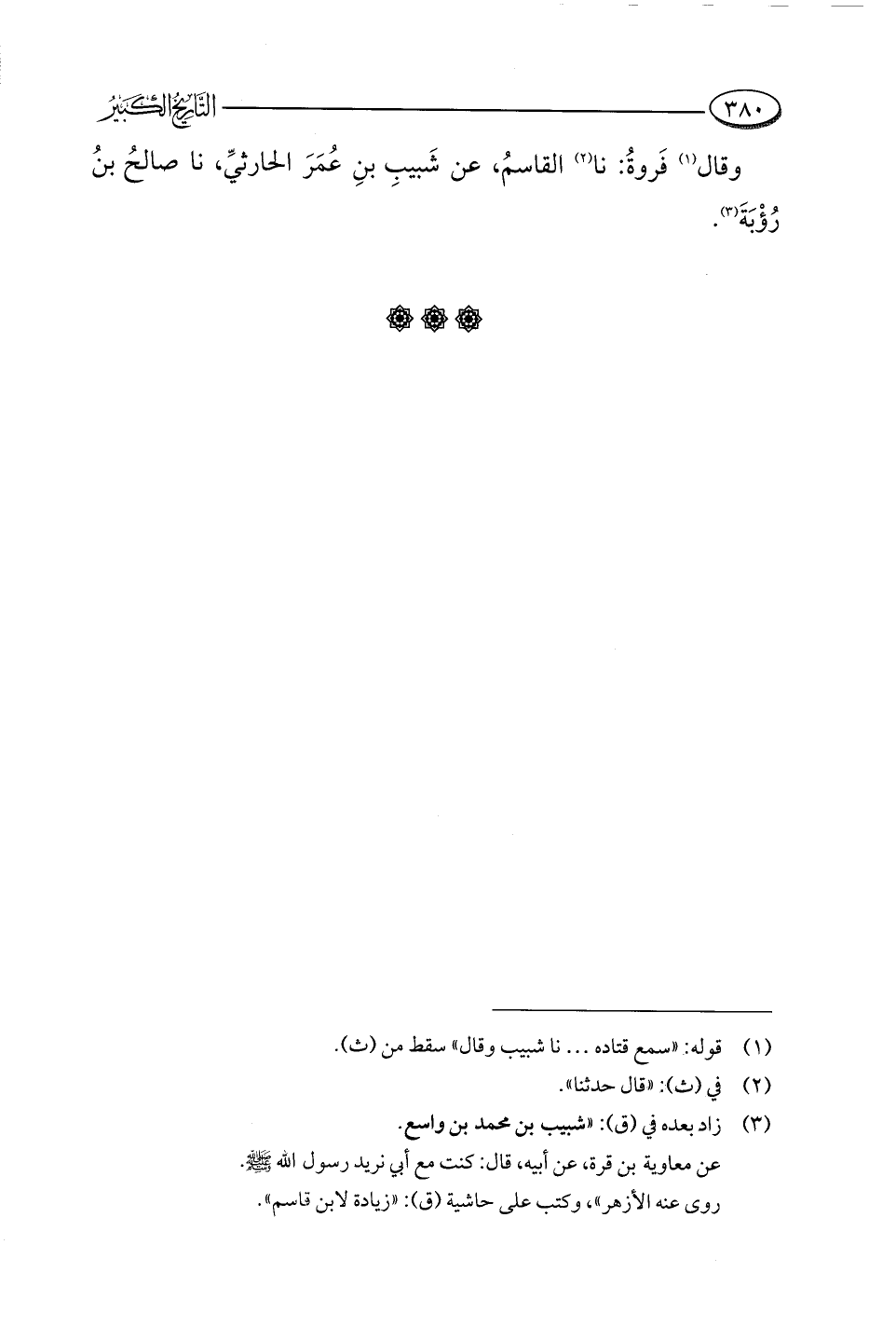 وقال (¬١) فَروةُ: نا (¬٢) القاسمُ، عن شَبيبِ بنِ عُمَرَ الحارثيِّ، نا صالحُ بنُ رُؤْبَةَ (¬٣).
