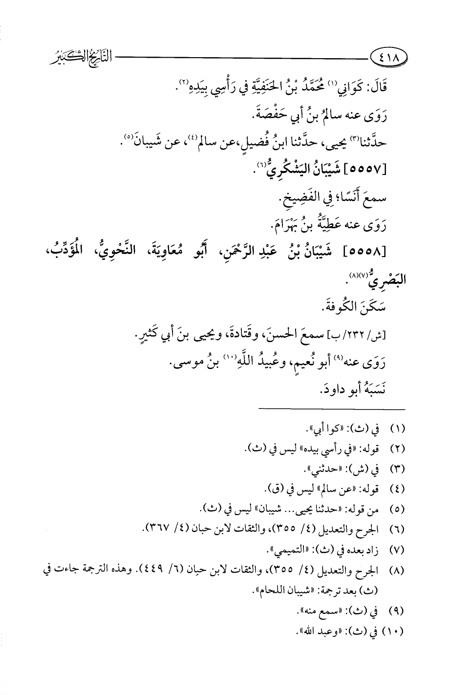 (¬٨) الجرح والتعديل (٤/ ٣٥٥)، والثقات لابن حبان (٦/ ٤٤٩). وهذه الترجمة جاءت في (ث) بعد ترجمة: "شيبان اللحام".