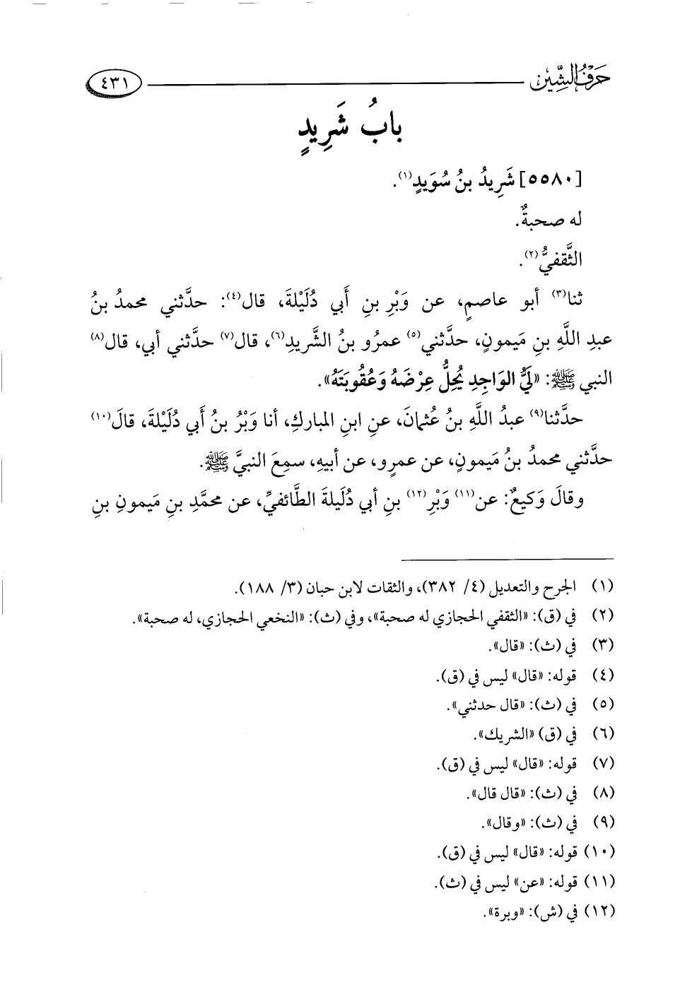 ثنا (¬٣) أبو عاصمٍ، عن وَبْرِ بنِ أَبي دُلَيْلةَ، قال (¬٤): حدَّثني محمدُ بنُ عبدِ اللَّهِ بنِ مَيمونٍ، حدَّثني (¬٥) عمرُو بنُ الشَّريدِ (¬٦)، قال (¬٧) حدَّثني أبي، قال (¬٨) النبي -صلى اللَّه عليه وسلم-: "لَيُّ الوَاجِدِ يُحِلُّ عِرْضَهُ وَعُقُوبَتَهُ".