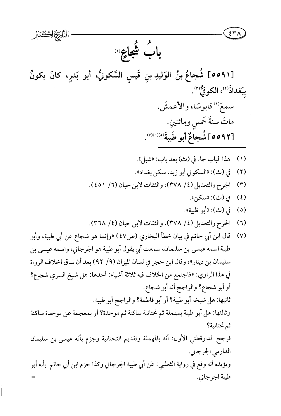 (¬٧) قال ابن أبي حاتم في بيان خطأ البخاري (ص ٤٧) "وإنما هو شجاع عن أبي طيبة، وأبو طيبة اسمه عيسى بن سليمان، سمعت أبي يقول أبو طيبة هو الجرجاني، واسمه عيسى بن سليمان بن دينار"، وقال ابن حجر في لسان الميزان (٩/ ٩٢) بعد أن ساق اخلاف الرواة في هذا الراوي: "فاجتمع من الخلاف فيه ثلاثة أشياء: أحدها: هل شيخ السري شجاع؟ أو أبو شجاع؟ والراجح أنه أبو شجاع.