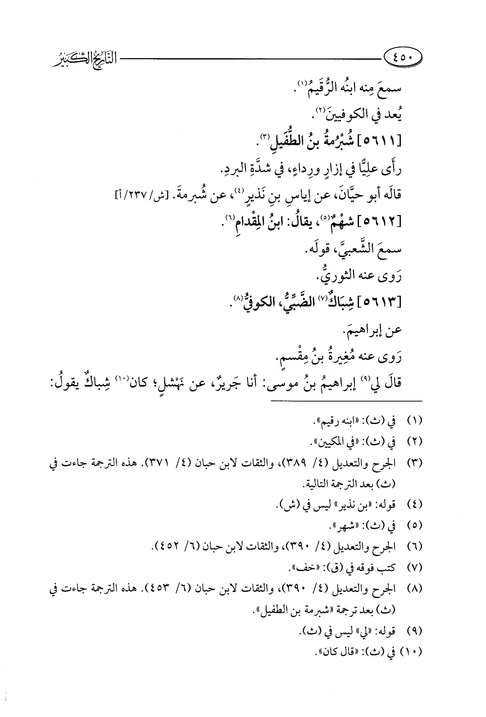 (¬٨) الجرح والتعديل (٤/ ٣٩٠)، والثقات لابن حبان (٦/ ٤٥٣). هذه الترجمة جاءت في (ث) بعد ترجمة "شبرمة بن الطفيل".