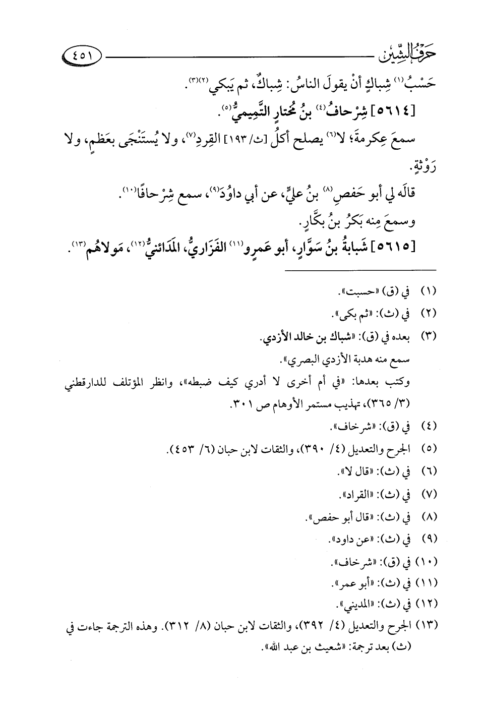(¬١٣) الجرح والتعديل (٤/ ٣٩٢)، والثقات لابن حبان (٨/ ٣١٢). وهذه الترجمة جاءت في (ث) بعد ترجمة: "شعيث بن عبد اللَّه".