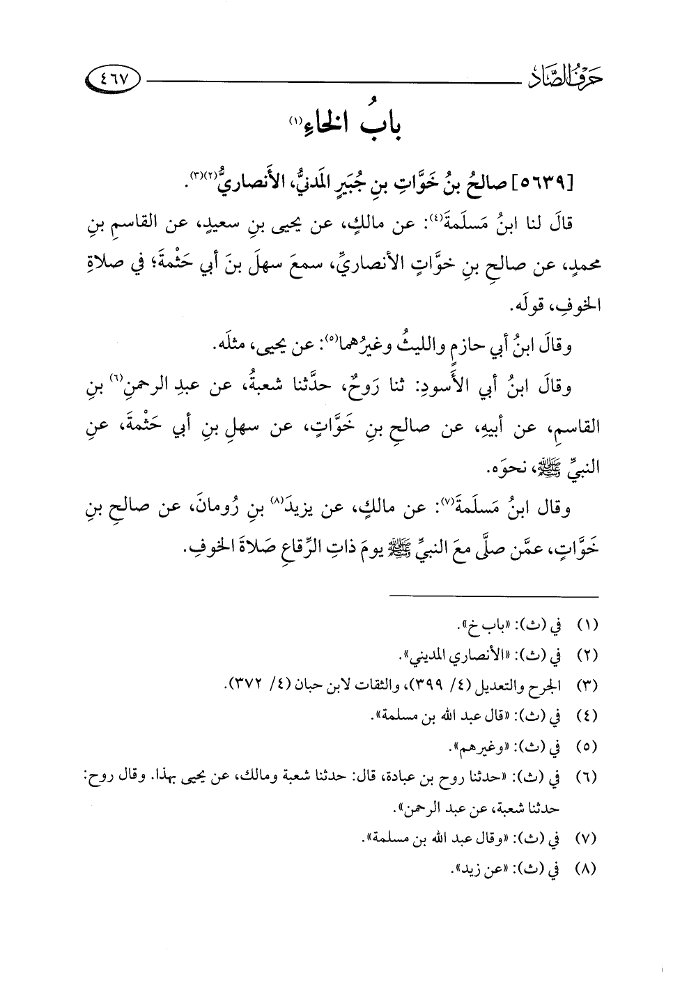 وقال ابنُ مَسلَمةَ (¬٧): عن مالكٍ، عن يزيدَ (¬٨) بنِ رُومانَ، عن صالحِ بنِ خَوَّاتٍ، عمَّن صلَّى معَ النبيِّ -صلى اللَّه عليه وسلم- يومَ ذاتِ الرِّقاعِ صَلاةَ الخوفِ.