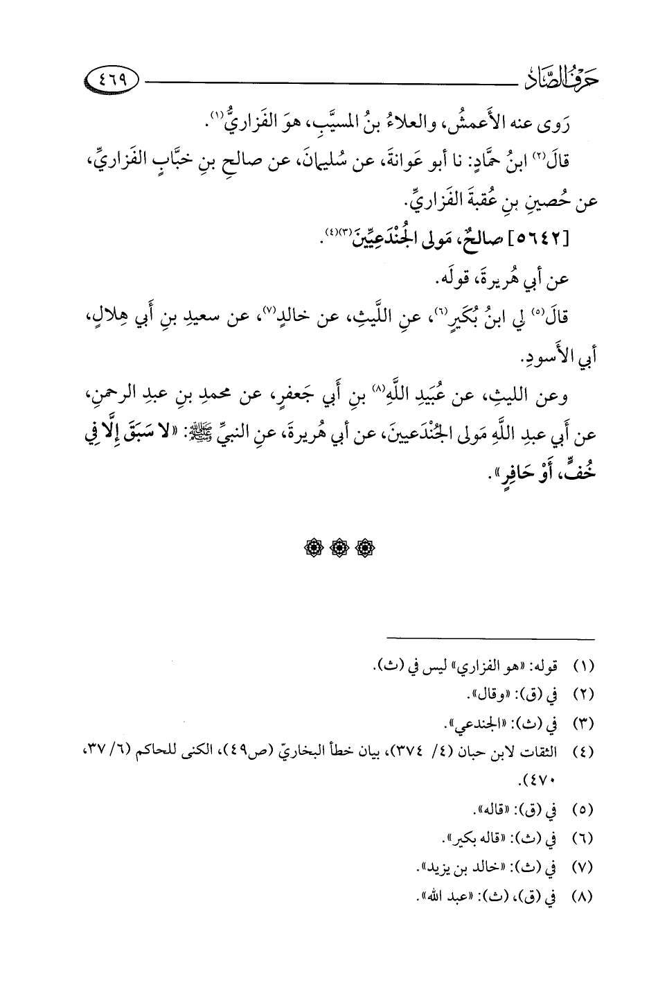 وعن الليثِ، عن عُبَيدِ اللَّهِ (¬٨) بنِ أَبي جَعفرٍ، عن محمدِ بنِ عبدِ الرحمنِ، عن أَبي عبدِ اللَّهِ مَولى الجُنْدَعيينَ، عن أبي هُريرةَ، عنِ النبيِّ -صلى اللَّه عليه وسلم-: "لا سبَقَ إِلَّا في خُفٍّ، أو حَافِرٍ".