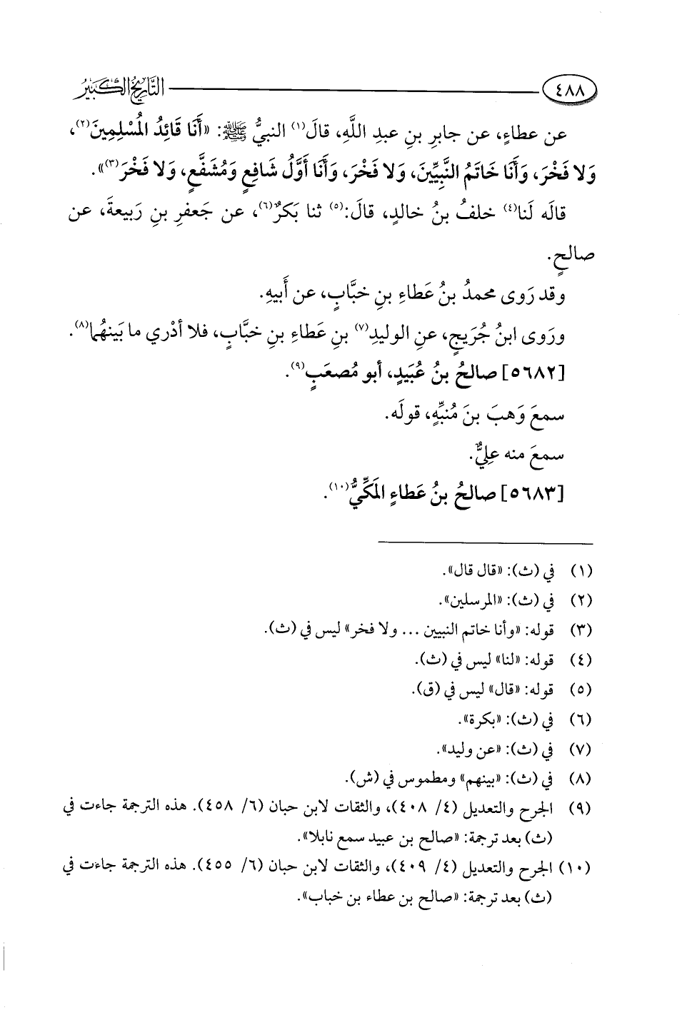 (¬١٠) الجرح والتعديل (٤/ ٤٠٩)، والثقات لابن حبان (٦/ ٤٥٥). هذه الترجمة جاءت في (ث) بعد ترجمة: "صالح بن عطاء بن خباب".