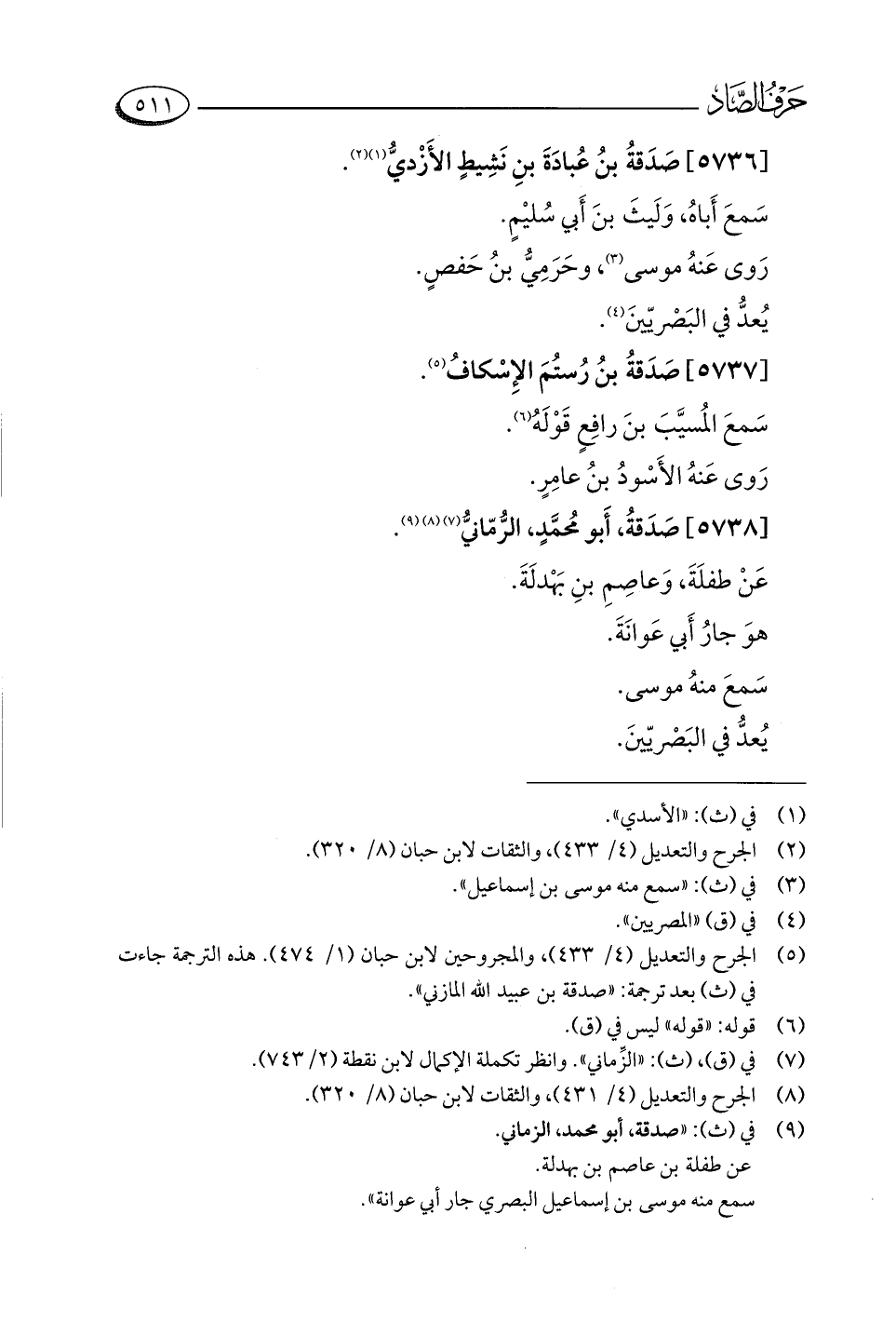 (¬٥) الجرح والتعديل (٤/ ٤٣٣)، والمجروحين لابن حبان (١/ ٤٧٤). هذه الترجمة جاءت في (ث) بعد ترجمة: "صدقة بن عبيد اللَّه المازني".