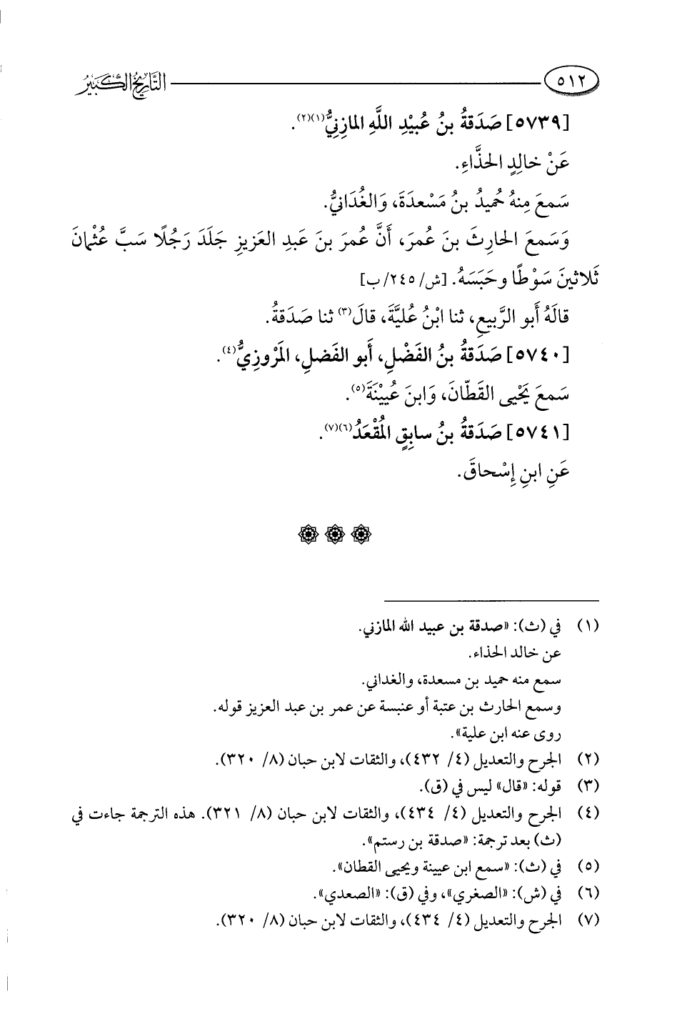 (¬٤) الجرح والتعديل (٤/ ٤٣٤)، والثقات لابن حبان (٨/ ٣٢١). هذه الترجمة جاءت في (ث) بعد ترجمة: "صدقة بن رستم".