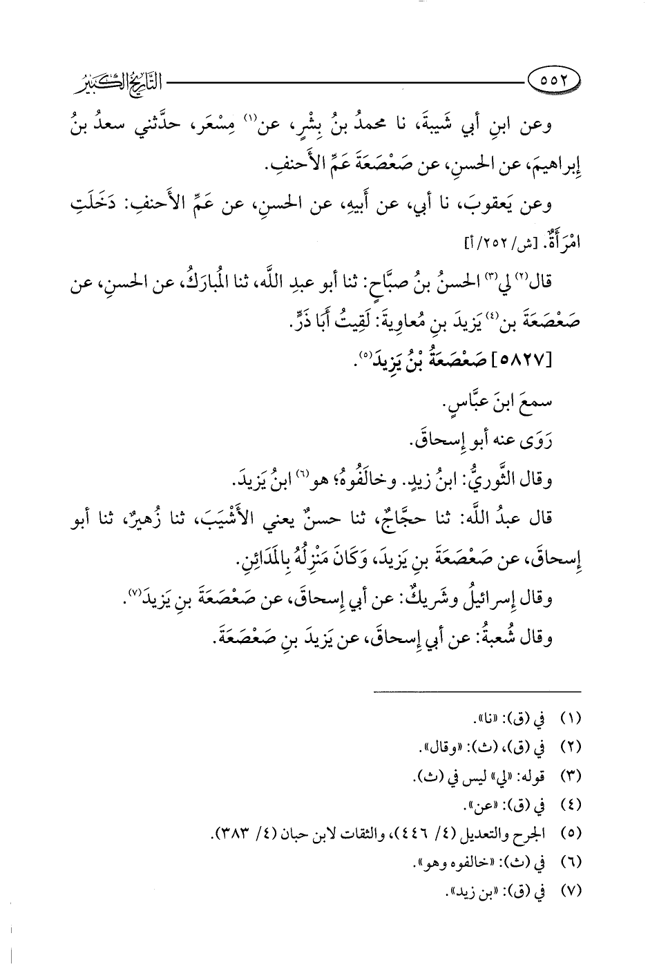 وعن ابنِ أبي شَيبةَ، نا محمدُ بنُ بِشْرٍ، عن (¬١) مِسْعَر، حدَّثني سعدُ بنُ إِبراهيمَ، عن الحَسنِ، عن صَعْصَعَةَ عَمِّ الأَحنفِ.