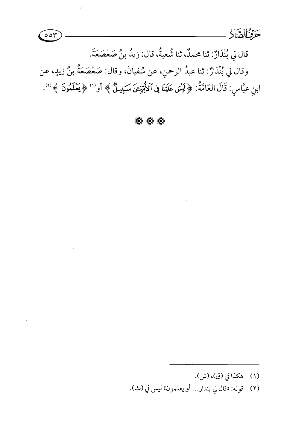 وقال لي بُنْدَارٌ: ثنا عبدُ الرحمنِ، عن سُفيانَ، وقال: صَعْصَعَةُ بنُ زَيْدٍ، عن ابنِ عبَّاسٍ: قال العَامَّةُ: {لَيْسَ عَلَيْنَا فِي الْأُمِّيِّينَ سَبِيلٌ} أو (¬١) {يَعْلَمُونَ} (¬٢).