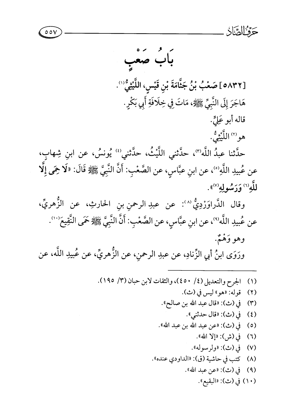 وقال الدَّراوَرْدِيُّ (¬٨): عن عبدِ الرحمنِ بنِ الحارثِ، عن الزُّهريِّ، عن عُبيدِ اللَّه (¬٩)، عن ابنِ عبَّاسٍ، عن الصَّعْبِ: أَنَّ النَّبِيَّ -صلى اللَّه عليه وسلم- حَمَى النَّقِيعَ (¬١٠).