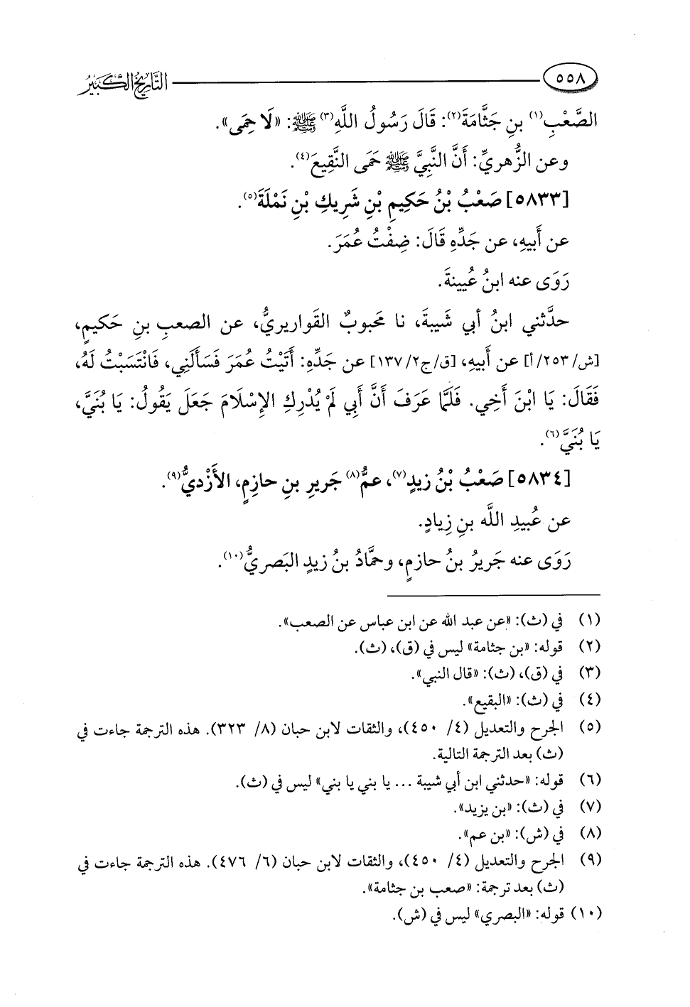 (¬٩) الجرح والتعديل (٤/ ٤٥٠)، والثقات لابن حبان (٦/ ٤٧٦). هذه الترجمة جاءت في (ث) بعد ترجمة: "صعب بن جثامة".