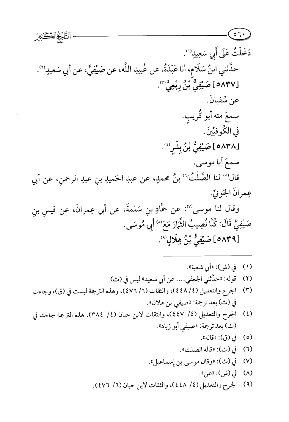 (¬٤) الجرح والتعديل (٤/ ٤٤٧)، والثقات لابن حبان (٤/ ٣٨٤). هذه الترجمة جاءت في (ث) بعد ترجمة: "صيفي أبو زياد".