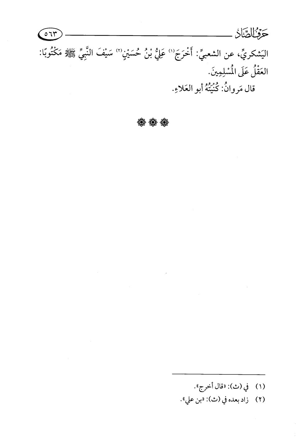 اليَشكريِّ، عن الشعبيِّ: أَخْرَجَ (¬١) عَليُّ بْنُ حُسَيْنٍ (¬٢) سَيْفَ النَّبِيِّ -صلى اللَّه عليه وسلم- مَكْتُوبًا: العَقْلُ عَلَى المُسْلِمِينَ.