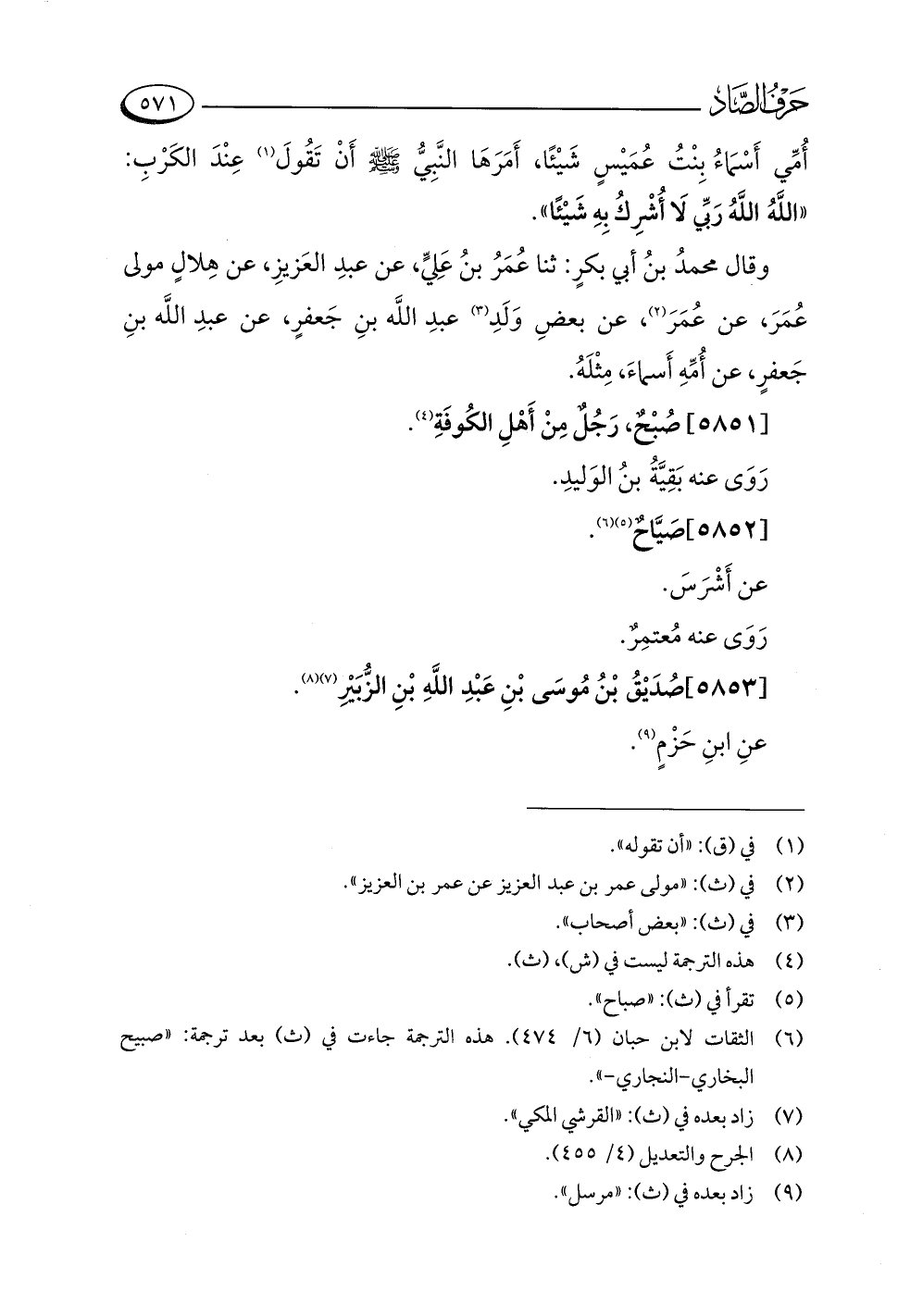 (¬٦) الثقات لابن حبان (٦/ ٤٧٤). هذه الترجمة جاءت في (ث) بعد ترجمة: "صبيح البخاري -النجاري-".