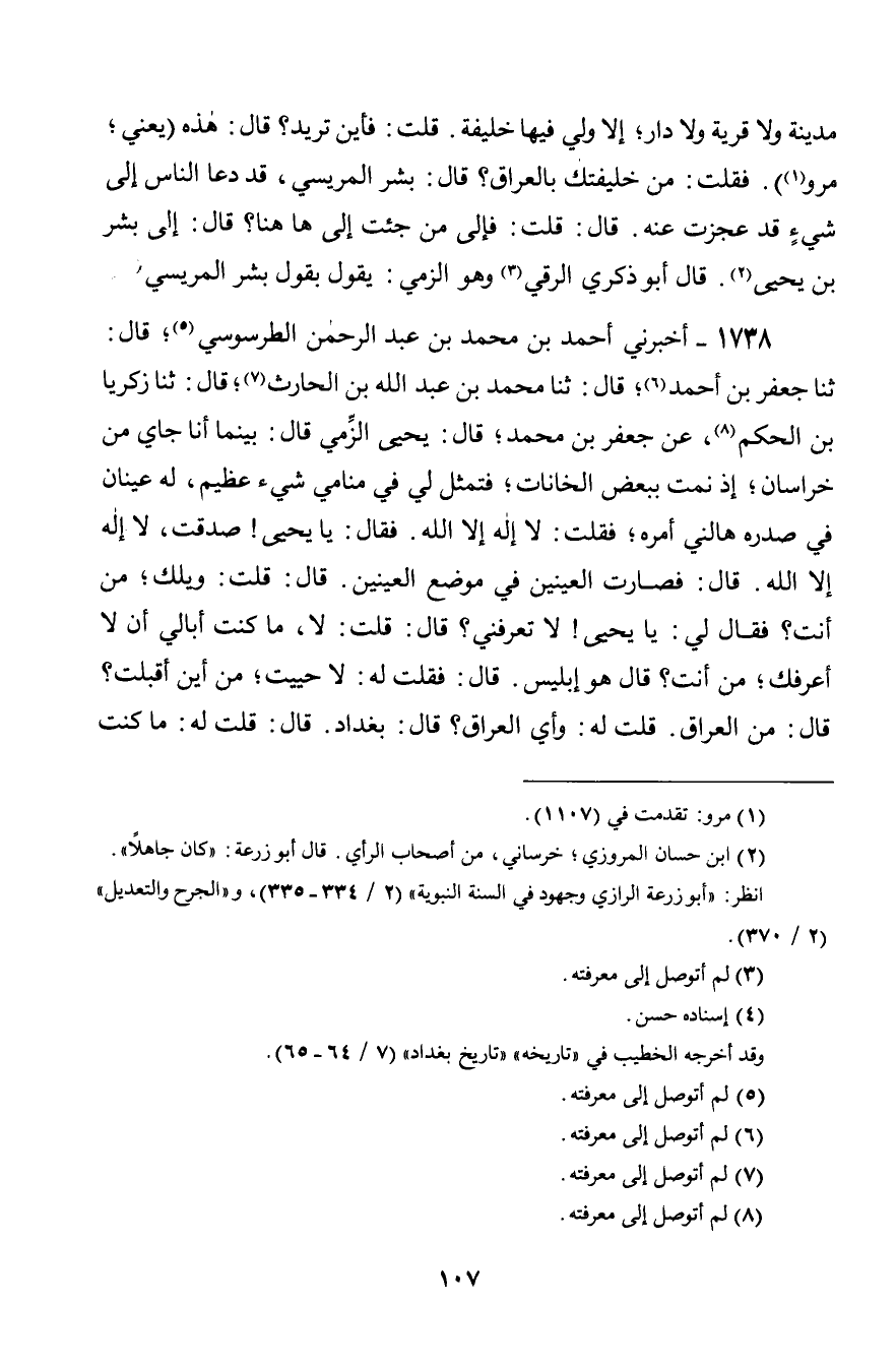 1738 - أَخْبَرَنِي أَحْمَدُ بْنُ مُحَمَّدِ بْنِ عَبْدِ الرَّحْمَنِ الطَّرَسُوسِيُّ، قَالَ: ثنا جَعْفَرُ بْنُ أَحْمَدَ، قَالَ: ثنا مُحَمَّدُ بْنُ عَبْدِ اللَّهِ بْنِ الْحَارِثِ، قَالَ: ثنا زَكَرِيَّا بْنُ الْحَكَمِ، عَنْ جَعْفَرِ بْنِ مُحَمَّدٍ، قَالَ يَحْيَى الزِّمِّيُّ قَالَ: بَيْنَمَا أَنَا جَاءٍ مِنْ خُرَاسَانَ، إِذْ نِمْتُ بِبَعْضِ الْخَانَاتِ، فَتَمَثَّلَ لِي فِي مَنَامِي شَيْءٌ عَظِيمٌ، لَهُ عَيْنَانِ فِي صَدْرِهِ، هَالَنِي أَمْرُهُ، فَقَالَتْ: لَا إِلَهَ إِلَّا اللَّهُ. فَقَالَ: يَا يَحْيَى، صَدَقْتَ، لَا إِلَهَ إِلَّا اللَّهُ. قَالَ: فَصَارَتِ الْعَيْنَانِ فِي مَوْضِعِ الْعَيْنَيْنِ. قَالَ: قُلْتُ: وَيْلَكَ، مَنْ أَنْتَ؟ فَقَالَ لِي: يَا يَحْيَى، لَا تَعْرِفُنِي؟ قَالَ: قُلْتُ لَا، مَا كُنْتُ أُبَالِي أَنْ لَا أَعْرِفَكَ، مَنْ أَنْتَ؟ قَالَ: هُو إِبْلِيسُ. قَالَ: فَقُلْتُ لَهُ: لَا حَيِيتَ، مِنْ أَيْنَ أَقْبَلْتَ؟ قَالَ: مِنَ الْعِرَاقِ. قُلْتُ لَهُ: وَأَيُّ الْعِرَاقِ؟ قَالَ: بَغْدَادُ. قَالَ: قُلْتُ لَهُ: مَا كُنْتَ -[108]- تَصْنَعُ بِبَغْدَادَ. قَالَ: أَسْتَخْلِفْ بِهَا خَلِيفَةً. قُلْتُ: وَمَنِ الَّذِي اسْتَخْلَفْتَ؟ قَالَ: اسْتَخْلَفْتُ بِشْرًا الْمِرِّيسِيَّ. قُلْتُ: وَمَا أَصَبْتَ أَوْثَقَ مِنْهُ تَسْتَخْلِفُهُ؟ قَالَ لِي: إِنَّهُ §دَعَا النَّاسَ إِلَى شَيْءٍ لَوْ دَعَوْتُهُمْ مَا أَجَابُونِي إِلَيْهِ. قَالَ: قُلْتُ لَهُ: إِلَى مَا دَعَاهُمْ قَالَ: إِلَى خَلْقِ الْقُرْآنِ , قَالَ: فَقُلْتُ لَهُ: يَا مَلْعُونُ، مَا تَقُولُ فِي الْقُرْآنِ؟ قَالَ لِي: اللَّهَ اللَّهَ يَا يَحْيَى، إِنْ كُنْتُ أَعْصِي اللَّهَ، فَإِنَّ الْقُرْآنَ كَلَامُ اللَّهِ لَيْسَ بِمَخْلُوقٍ، وَلَا بِمَجْهُولٍ. قَالَ أَبُو يَحْيَى: قَالَ أَحْمَدُ بْنُ حَنْبَلٍ: «لَوْ رَحَلَ فِي هَذَا إِلَى خُرَاسَانَ أَوْ إِلَى مِصْرَ لَكَانَ قَلِيلٌ»