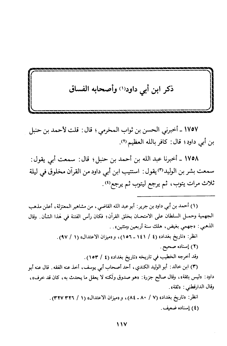 1758 - أَخْبَرَنَا عَبْدُ اللَّهِ بْنُ أَحْمَدَ بْنِ حَنْبَلٍ، قَالَ: سَمِعْتُ أَبِي يَقُولُ: سَمِعْتُ بِشْرَ بْنَ الْوَلِيدِ، يَقُولُ: «§اسْتُتِيبَ ابْنُ أَبِي دَاوُدَ مِنَ الْقُرْآنِ مَخْلُوقٌ فِي لَيْلَةٍ ثَلَاثَ مَرَّاتٍ يَتُوبُ، ثُمَّ يَرْجِعُ لِيَتُوبَ، ثُمَّ يَرْجِعُ»