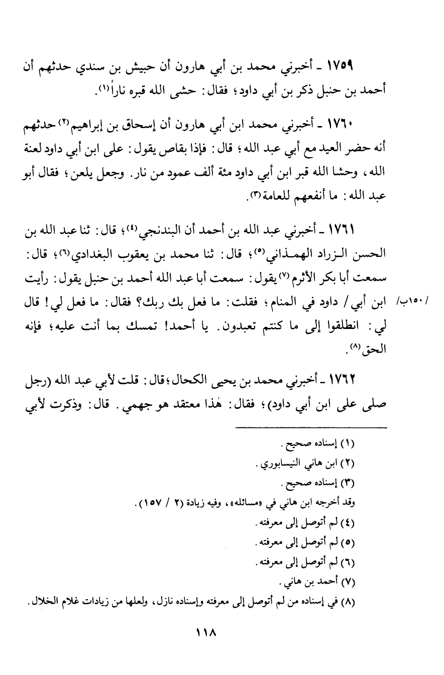 1761 - أَخْبَرَنِي عَبْدُ اللَّهِ بْنُ أَحْمَدَ، أَنَّ الْبَنْدَنْجِيَّ قَالَ: ثنا عَبْدُ اللَّهِ بْنُ الْحَسَنِ الزَّرَّادُ الْهَمَذَانِيُّ، قَالَ: ثنا مُحَمَّدُ بْنُ يَعْقُوبَ الْبَغْدَادِيُّ، قَالَ: سَمِعْتُ أَبَا بَكْرٍ الْأَثْرَمَ، يَقُولُ: سَمِعْتُ أَبَا عَبْدِ اللَّهِ أَحْمَدَ بْنَ حَنْبَلٍ يَقُولُ: " رَأَيْتُ ابْنَ أَبِي دَاوُدَ فِي الْمَنَامِ، فَقُلْتُ: مَا فَعَلَ بِكَ رَبُّكَ؟ فَقَالَ: مَا فَعَلَ لِي قَالَ لِي: انْطَلِقُوا إِلَى مَا كُنْتُمْ تَعْبُدُونَ. يَا أَحْمَدُ، §تَمَسَّكْ بِمَا أَنْتَ عَلَيْهِ، فَإِنَّهُ الْحَقُّ "