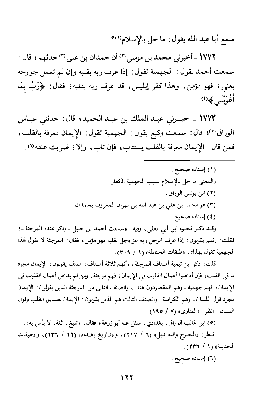 1772 - أَخْبَرَنِي مُحَمَّدُ بْنُ مُوسَى، أَنَّ حَمْدَانَ بْنَ عَلِيٍّ حَدَّثَهُمْ، قَالَ: سَمِعْتُ أَحْمَدَ، يَقُولُ: الْجَهْمِيَّةُ تَقُولُ: §إِذَا عَرَفَ رَبَّهُ بِقَلْبِهِ، وَإِنْ لَمْ تَعْمَلْ جَوَارِحُهُ يَعْنِي، فَهُوَ مُؤْمِنٌ، وَهَذَا كُفْرُ إِبْلِيسَ، قَدْ عَرَفَ رَبَّهُ بِقَلْبِهِ، فَقَالَ: {رَبِّ بِمَا أَغْوَيْتَنِي} [الحجر: 39] "
