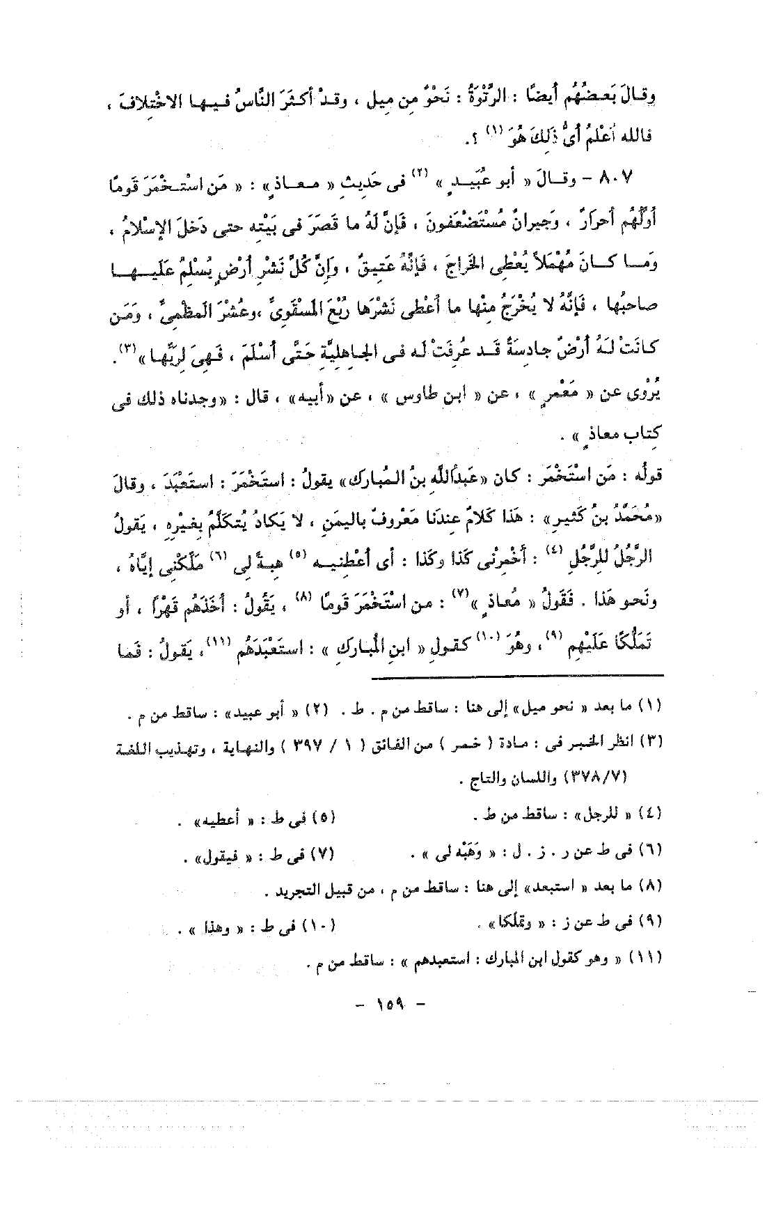 807 - وقال «أبو عبيد» في حديث «معاذ»: «من استخمر قومًا أولهم أحرار, وجيران مستضعفون, فإن له ما قصر في بيته حتى دخل الإسلام, وما كان مهملًا يعطى الخراج, فإنه عتيق, وإن كل نشر أرض يسلم عليها صاحبها, فإنه لا يخرج منها ما أعطى نشرها ربع المسقوى, وعشر المظمى, ومن كانت له أرض جادسة قد عرفت له فى الجاهلية حتى أسلم, فهى لربها».